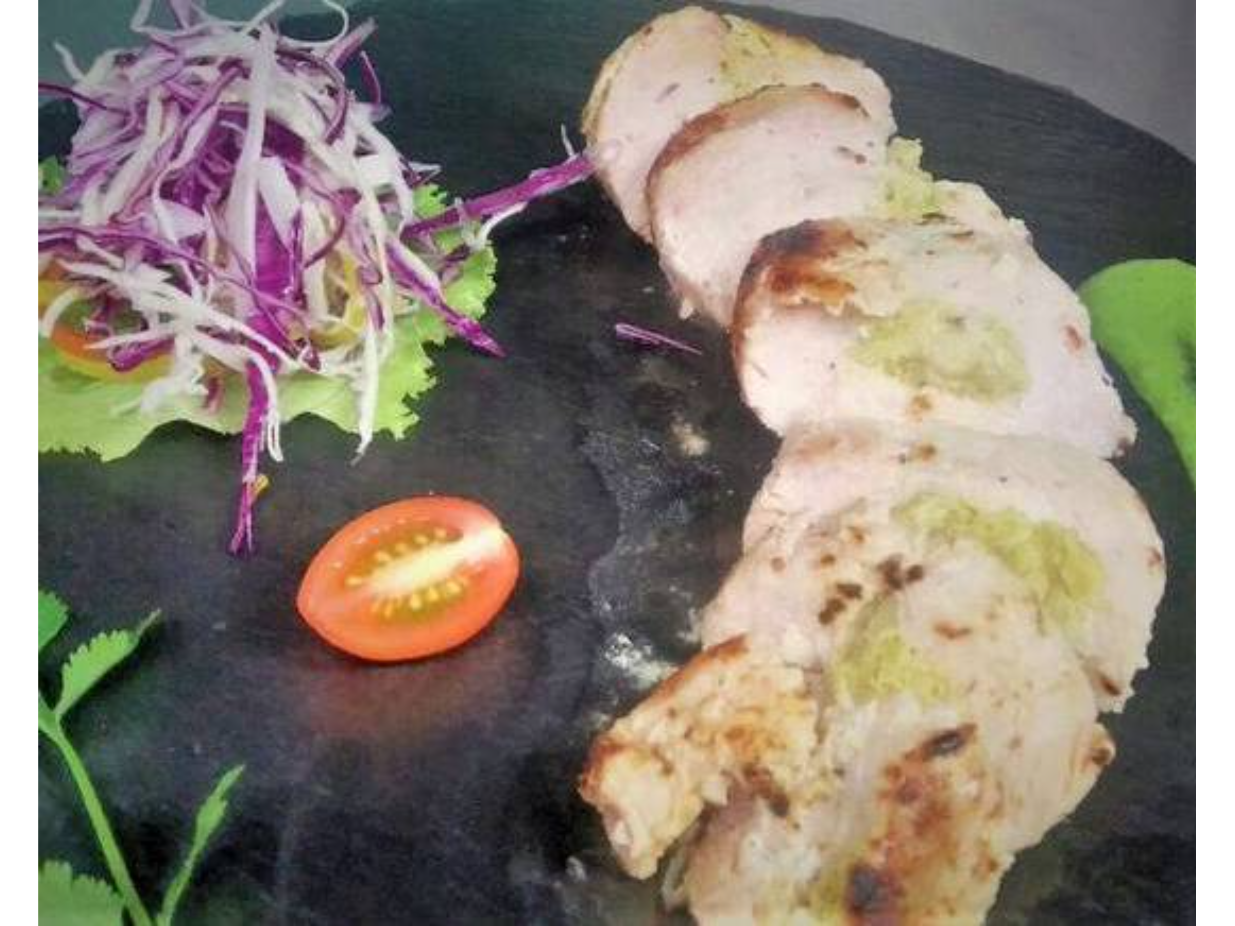 Boneless chicken breast stuffed with pistachio; chicken mince, & saffron.