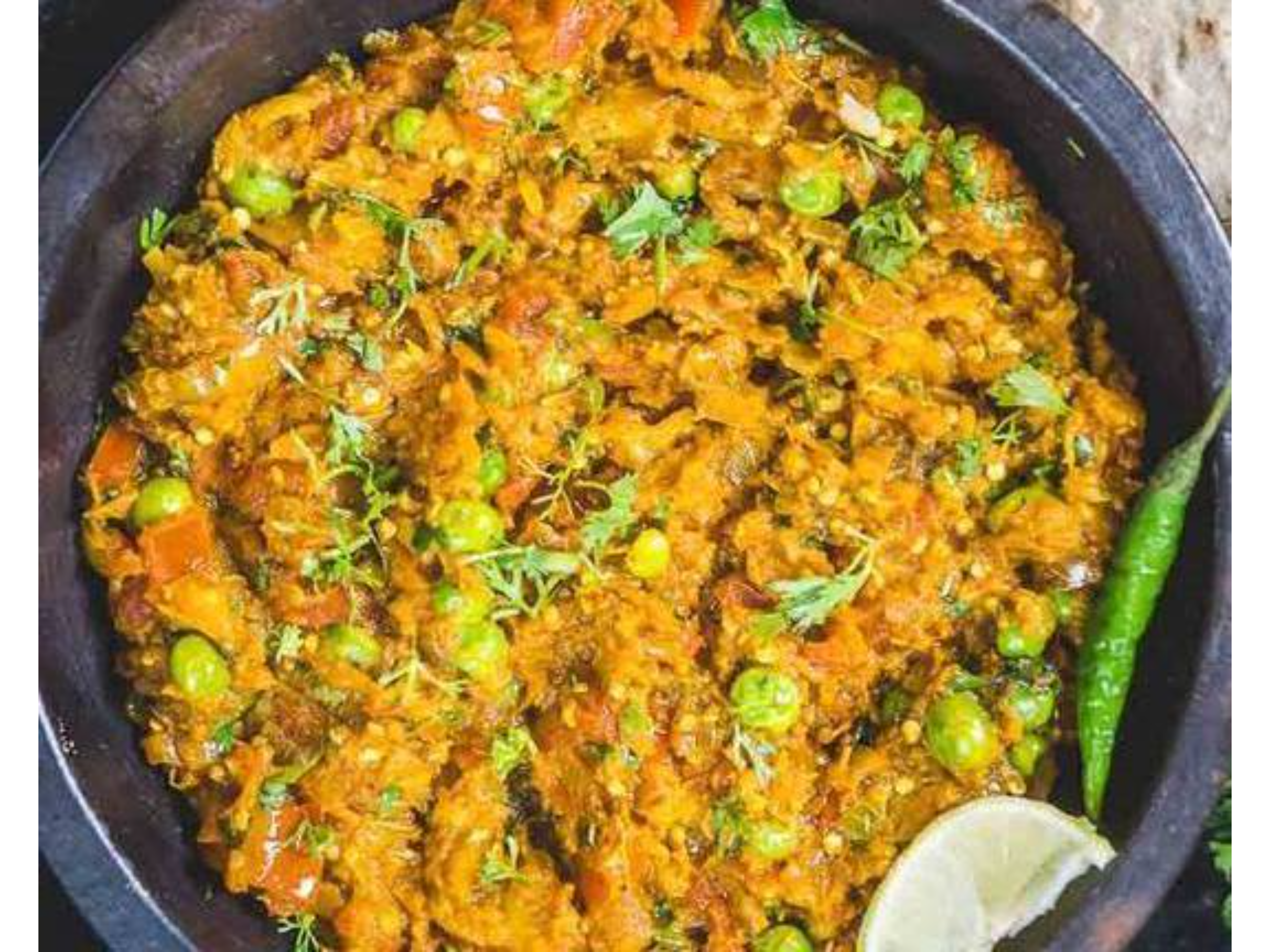 Eggplant roasted, mashed & cooked with onions, tomatoes & garam masala.