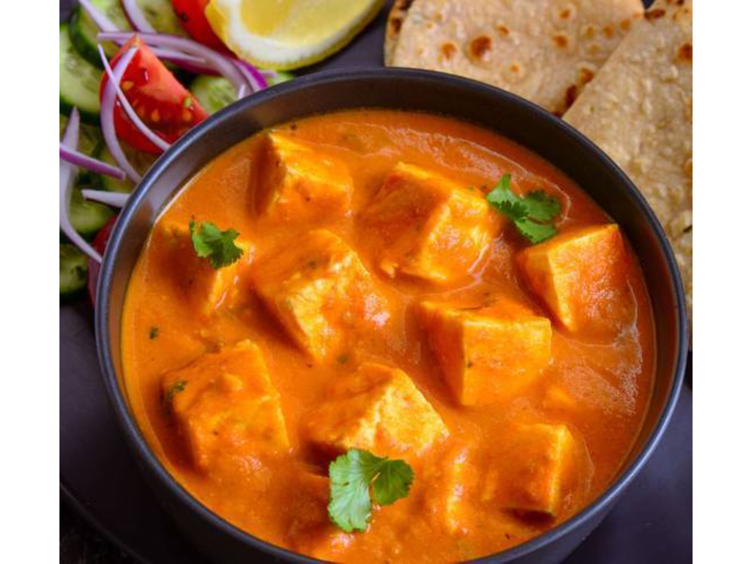 Homemade whole milk cottage cheese cubes cooked in thick curry of tomatoes & onions with garam masala.
