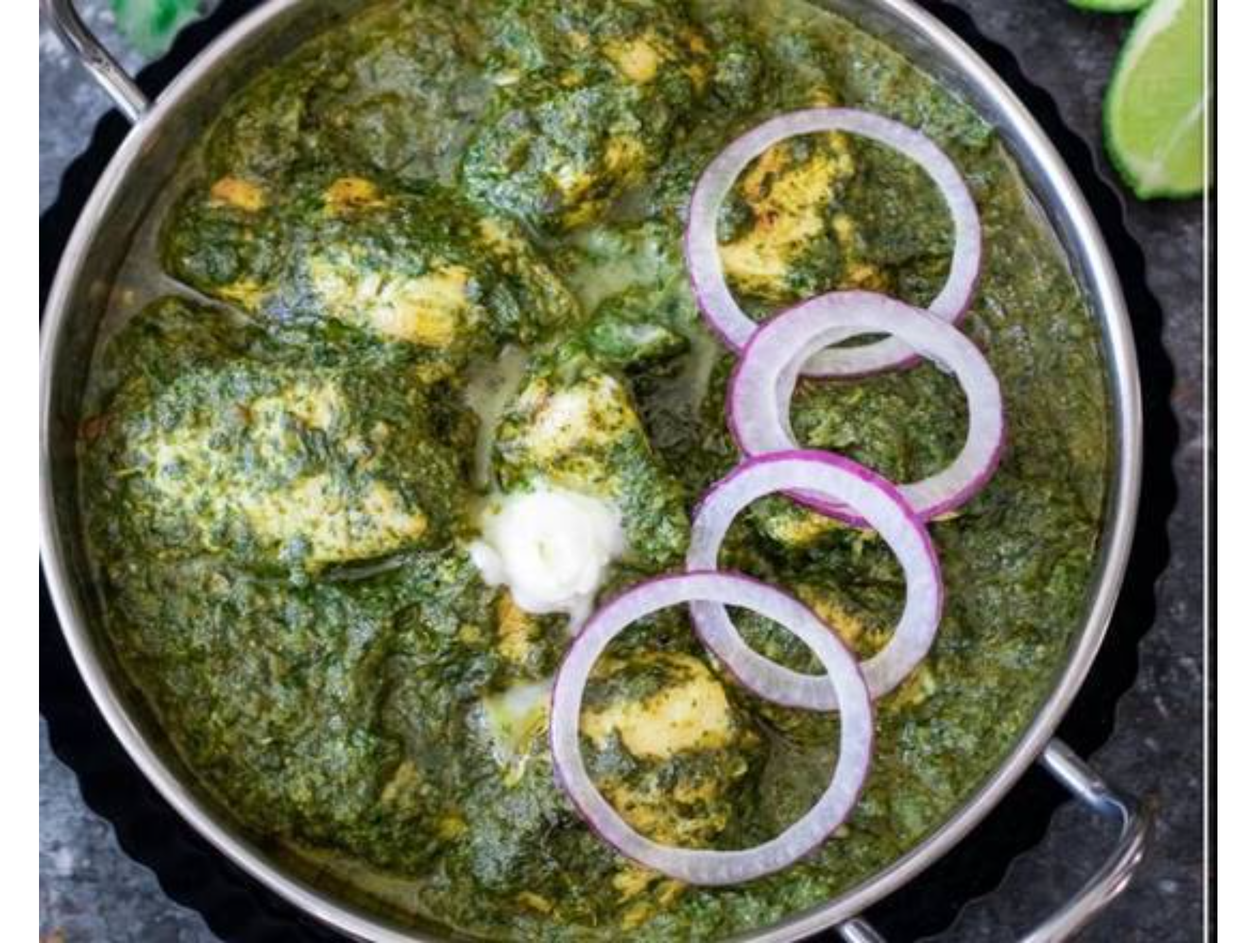 Boneless chicken pieces cooked in spinach, garlic, fenugreek, chopped onions & tomatoes.