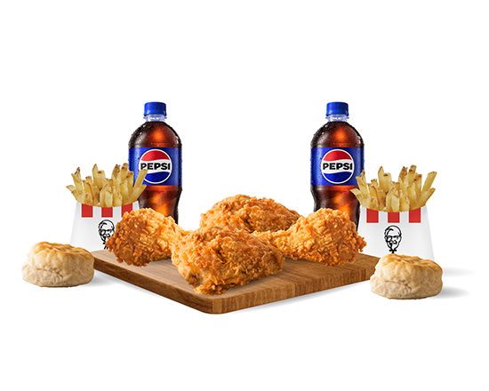 4 PIEZAS DE POLLO, 2 ACOMPAÑAMIENTOS PEQUEÑOS, 2 BISCUITS, 2 BEBIDAS DE 600ML