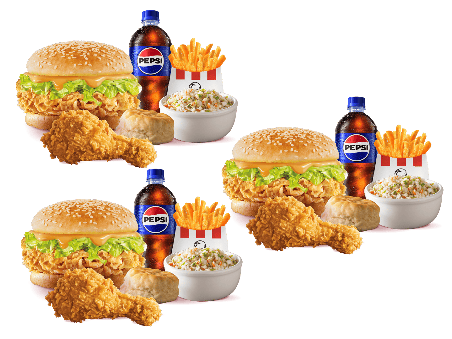 3 PIEZAS DE POLLO, 3 HAMBURGUESAS CREAMY BBQ, 3 BISCUITS, 3 PAPAS INDIVIDUALES, 3 ENSALADAS PEQUEÑAS, 3 BEBIDAS DE 600ml