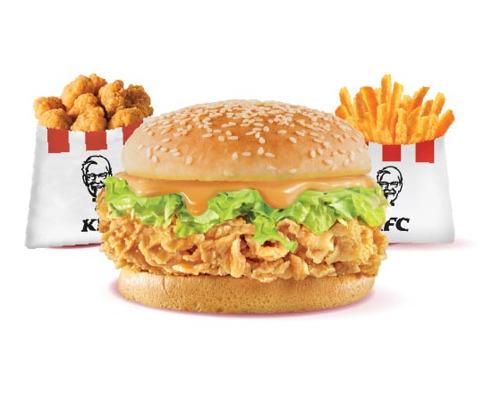 1PIEZA DE POLLO, UNA HAMBURGUESA CREAMY BBQ, 1 BISCUIT, PAPAS FRITAS INDIVIDUALES, ENSALADA DE REPOLLO PEQUEÑA, BEBIDA 600ML