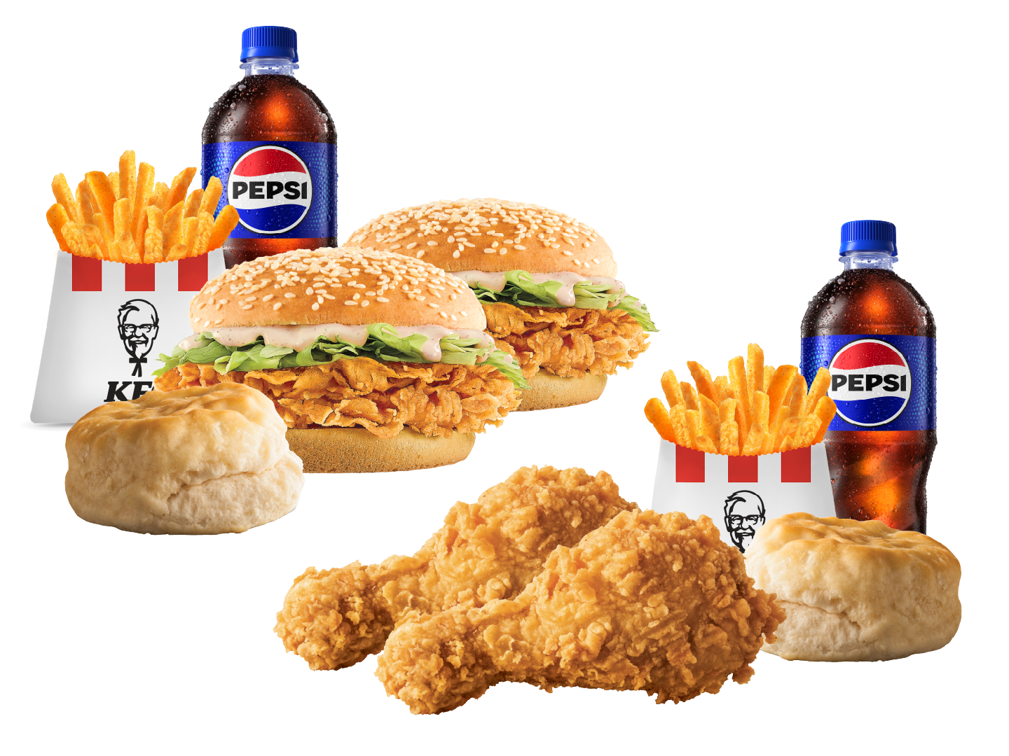 10 PIEZAS DE POLLO, 1 HAMBURGUESA DOUBLE CHEESY, 2 PAPAS FRITAS INDIVIDUALES, 1 PURE DE PAPA INDIVIDUAL, 1 ENSALADA DE REPOLLO INDIVIDUAL, 2 BISCUITS