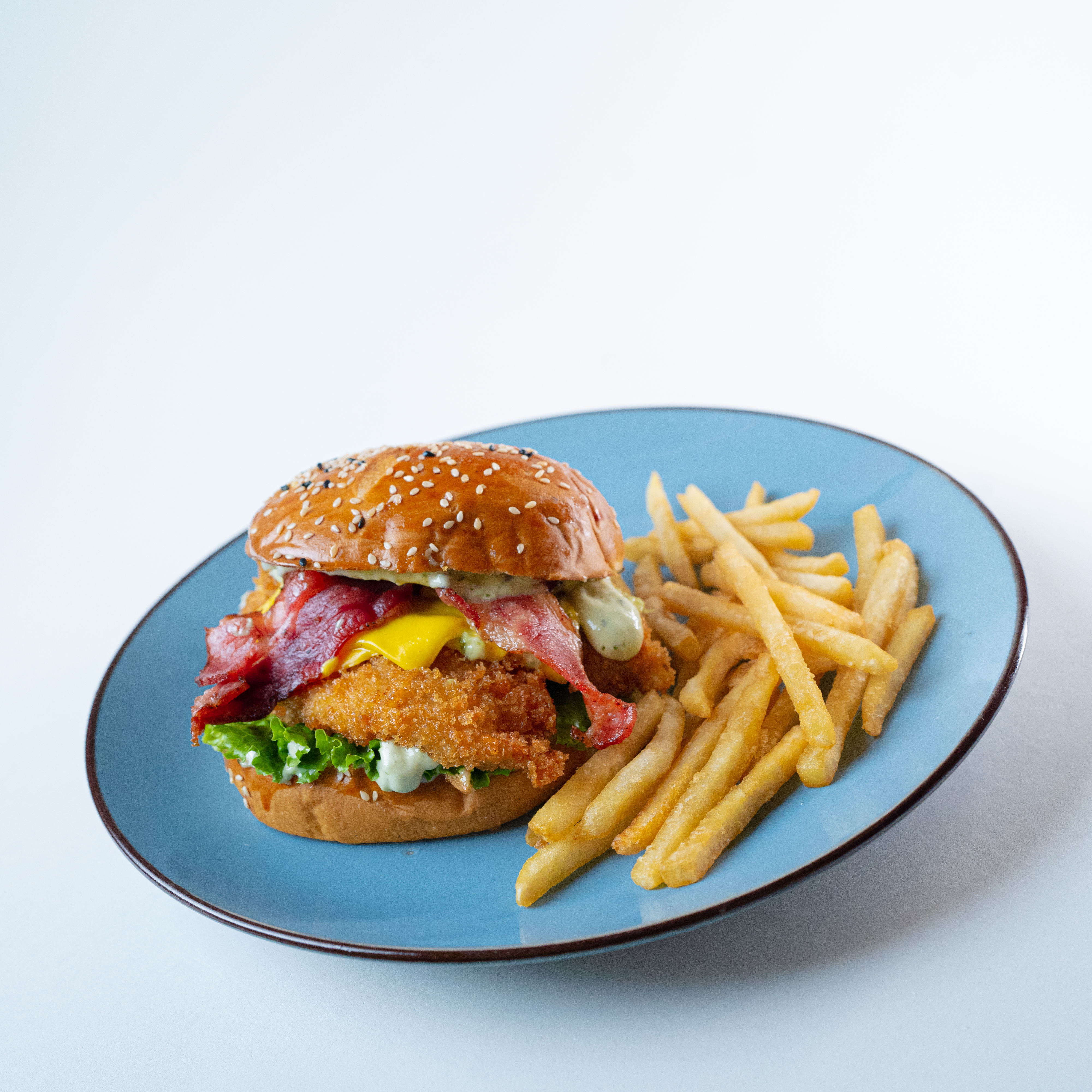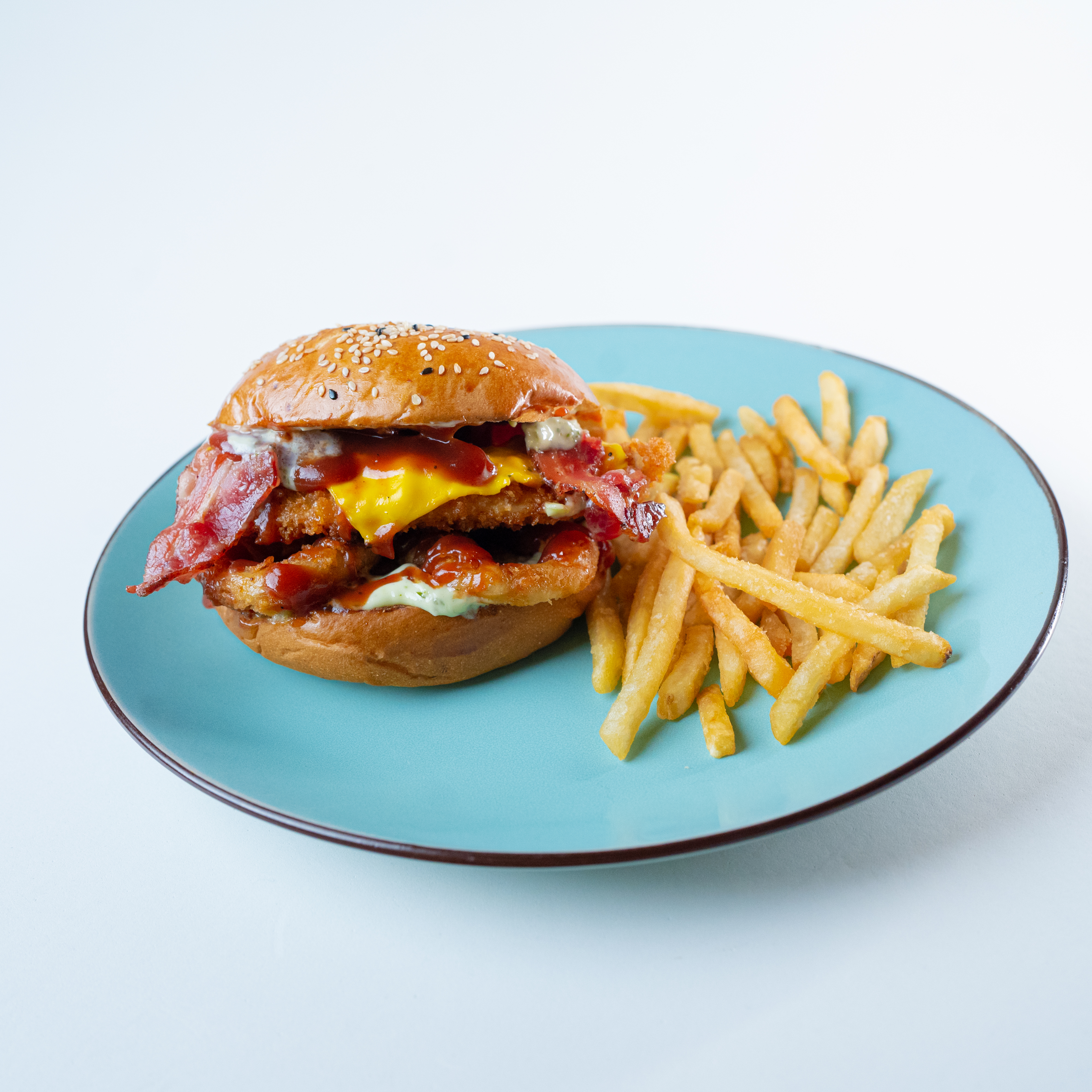 Filet de pollo empanizado, queso, tocino, aros de cebolla, salsa BBQ y mayonesa. Incluye papas.