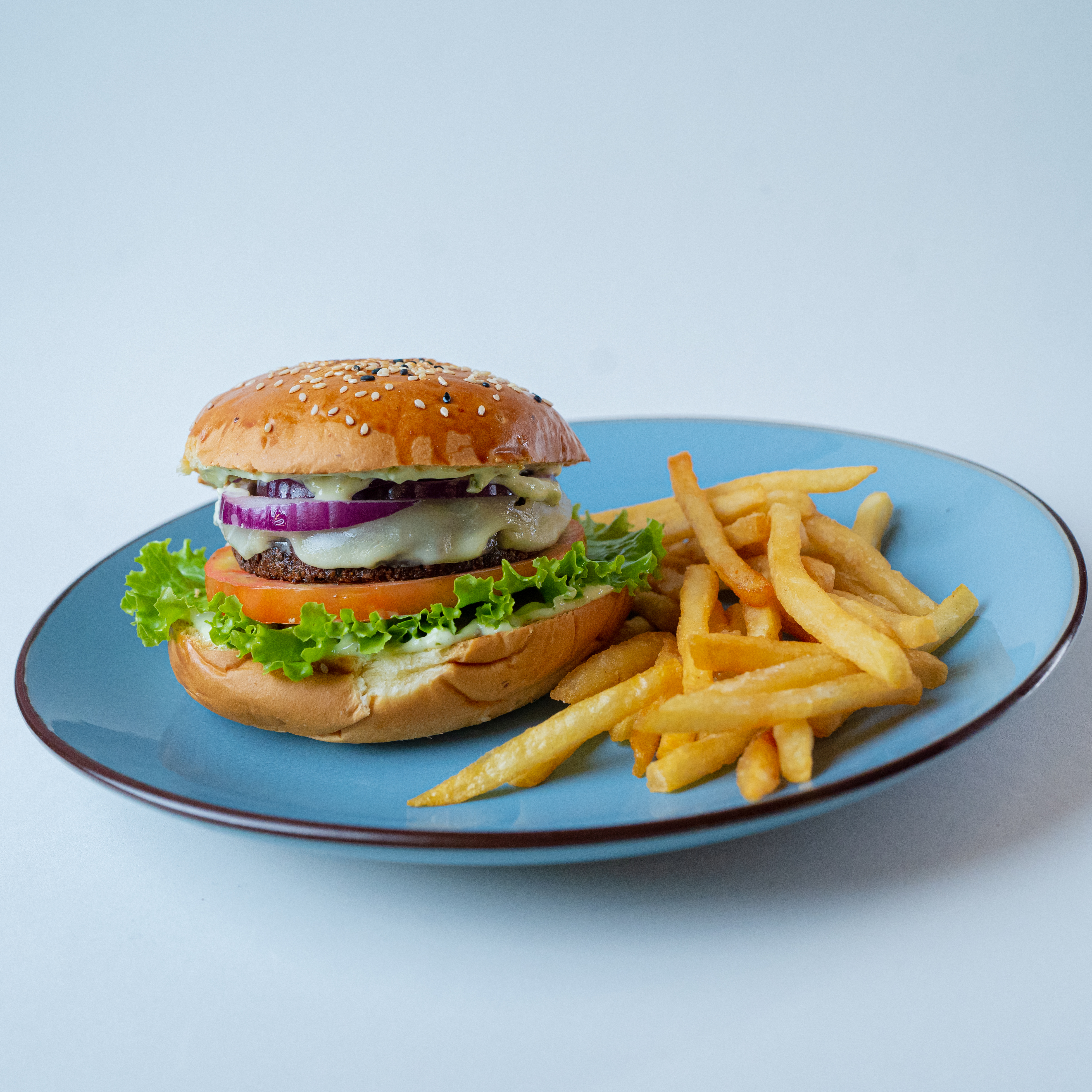 Torta falafel, queso provolone, tomate, cebolla morada, lechuga. Mayonesa.Incluye papas.