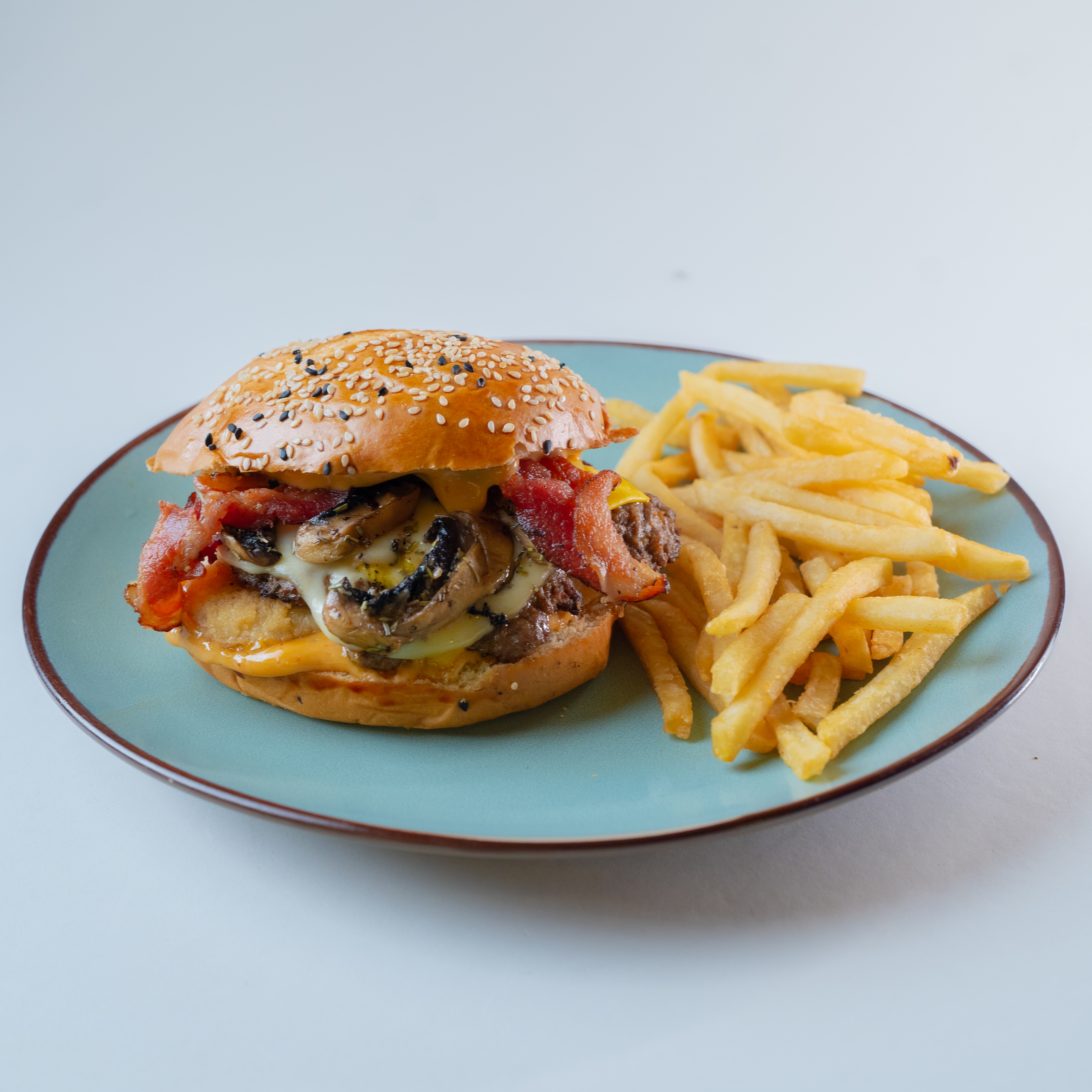 Queso provolone, hongos salteados, cebolla caramelizada y mayonesa premium. Incluye papas y torta artesanal de 1/4 de libra.