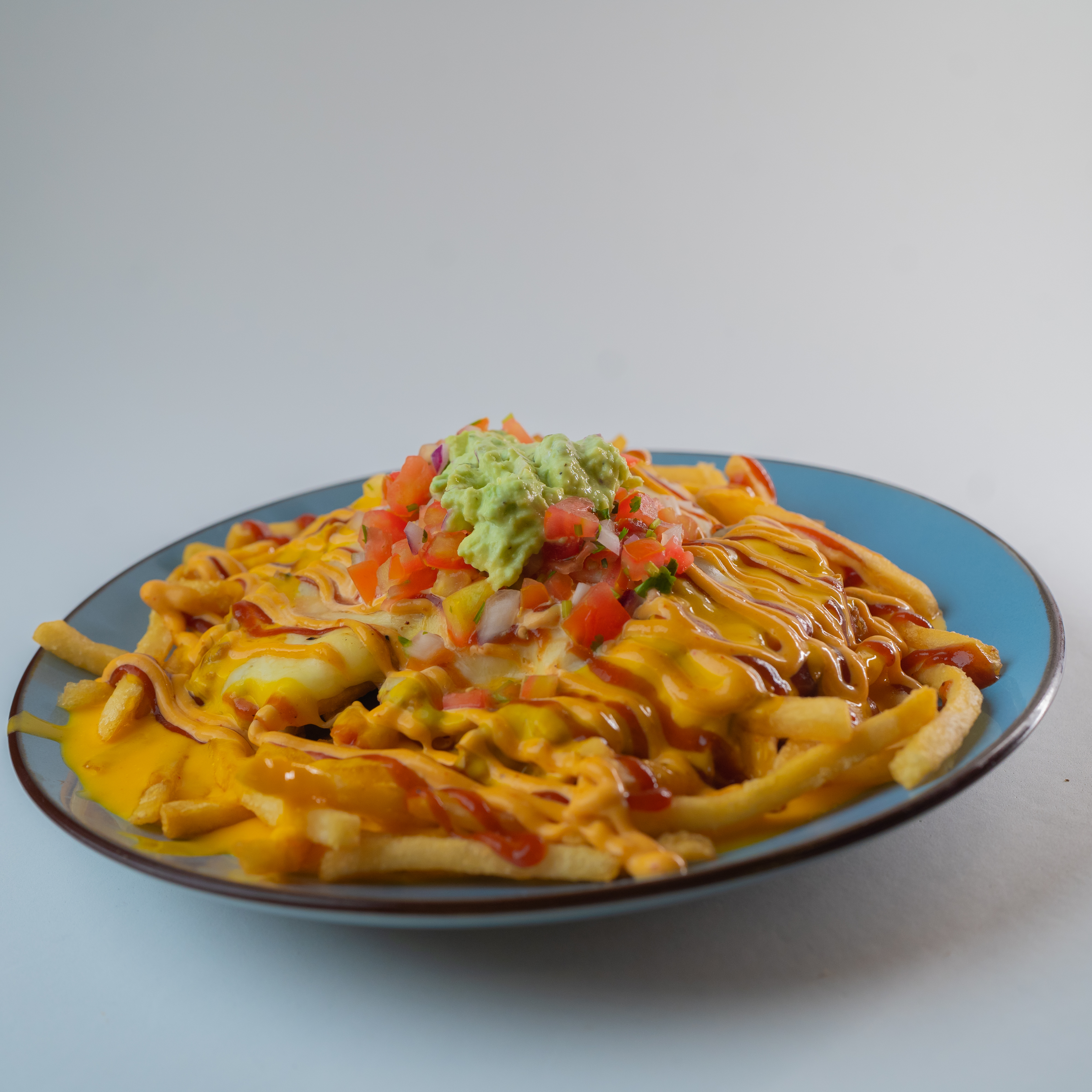 Carne mechada con queso mozzarella, pico de gallo, frijoles molidos, guacamole y salsa de queso.