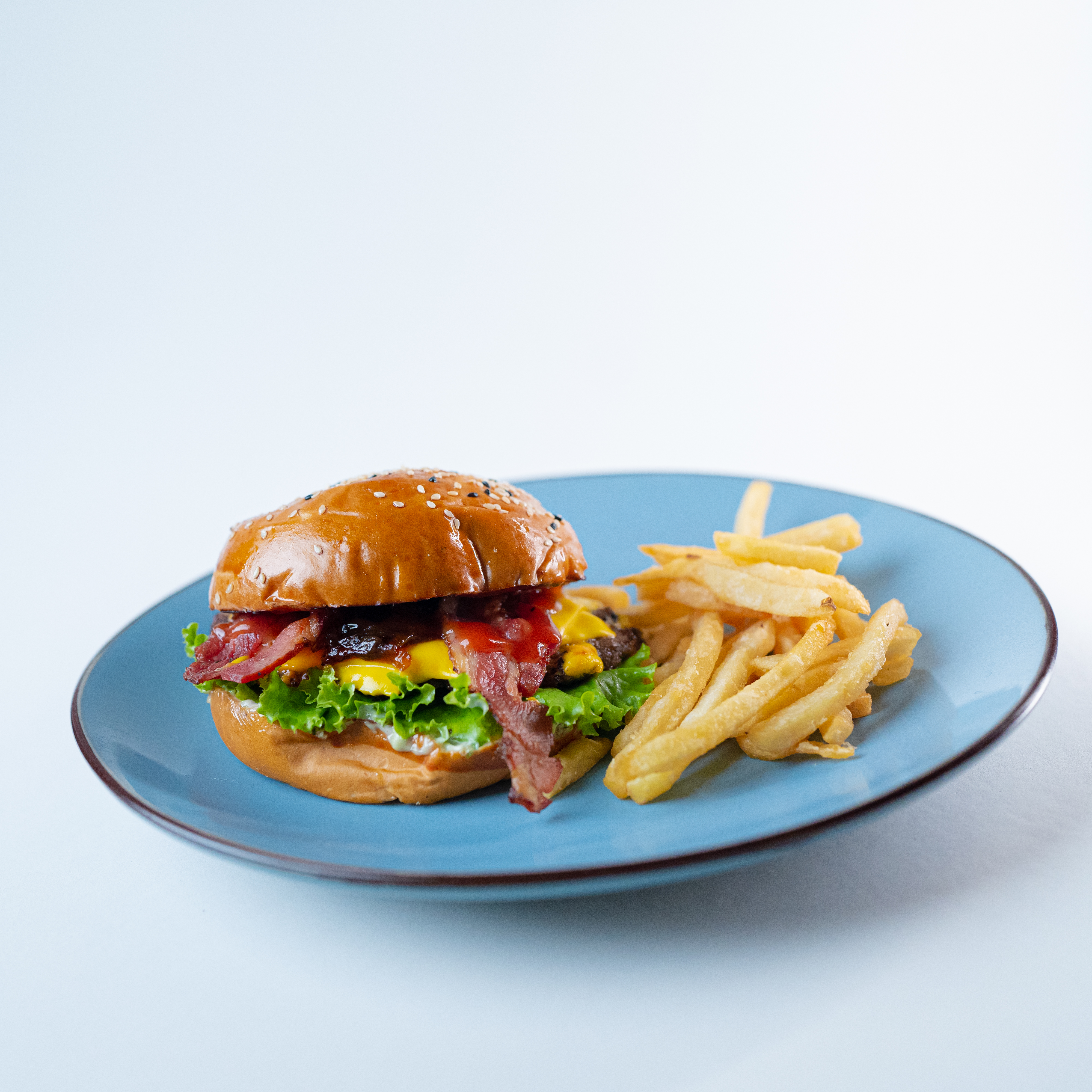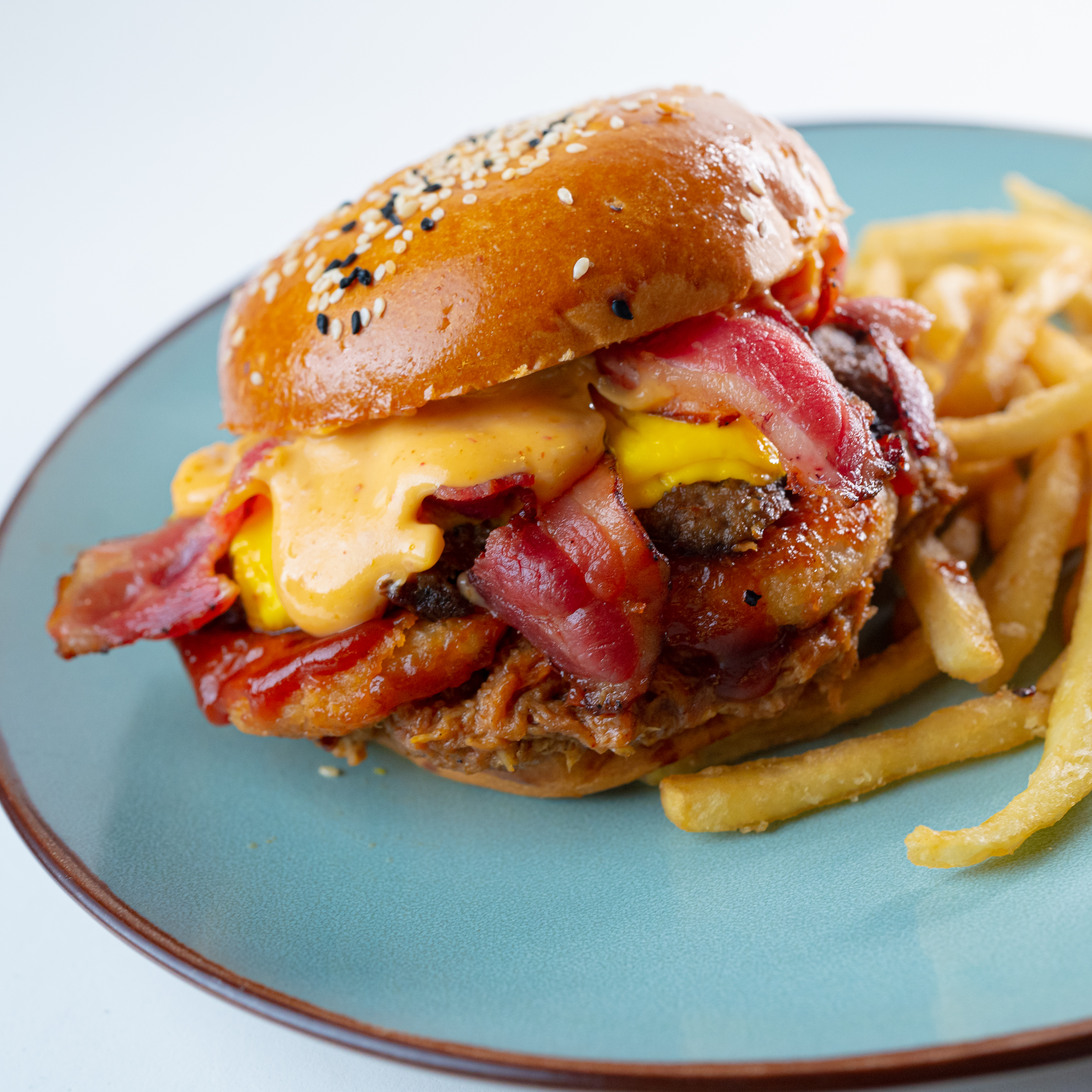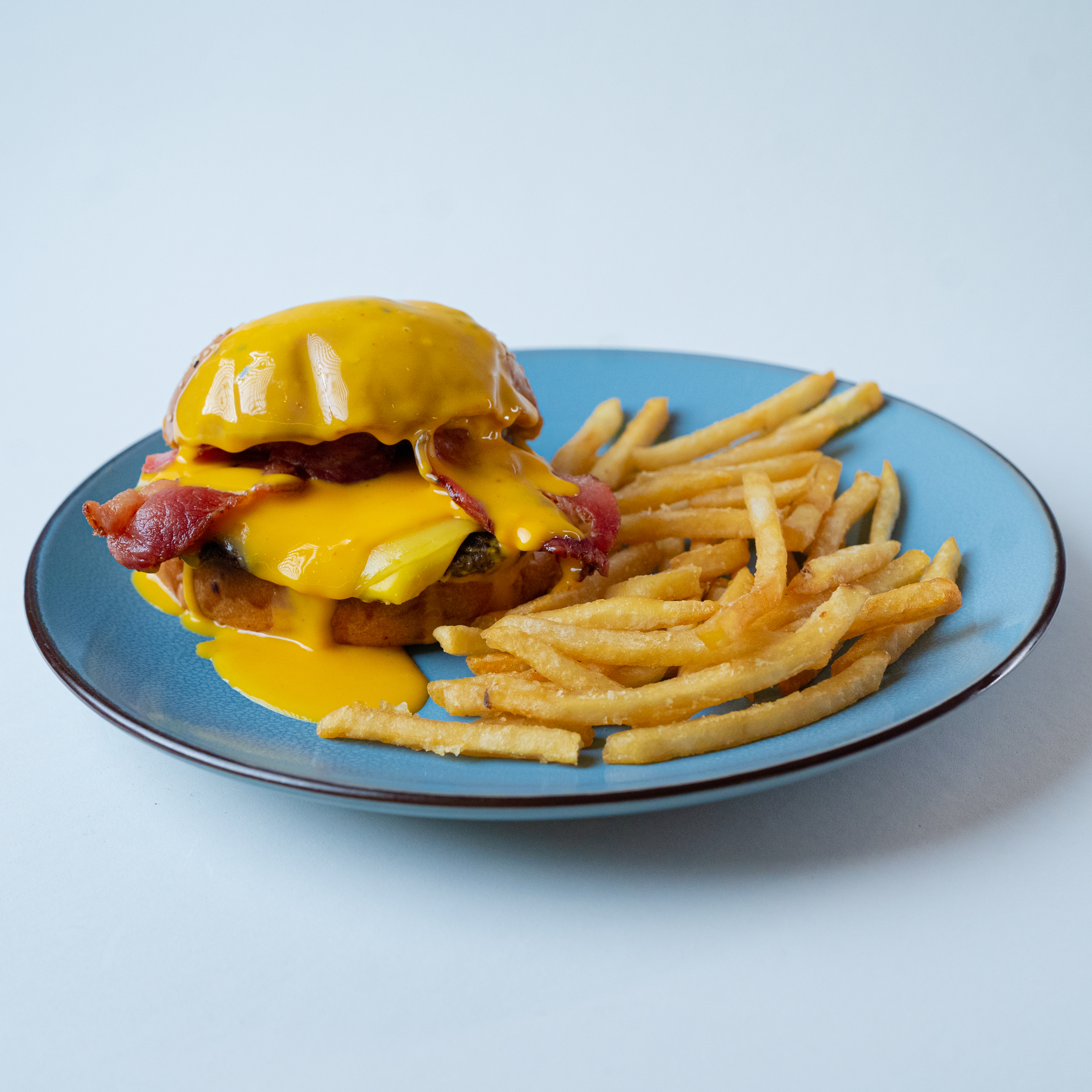 Queso, tocino, aros de cebolla, salsa sweet chipotle y torta artesanal de 1/4 de libra, acompañada de papas (150 g).