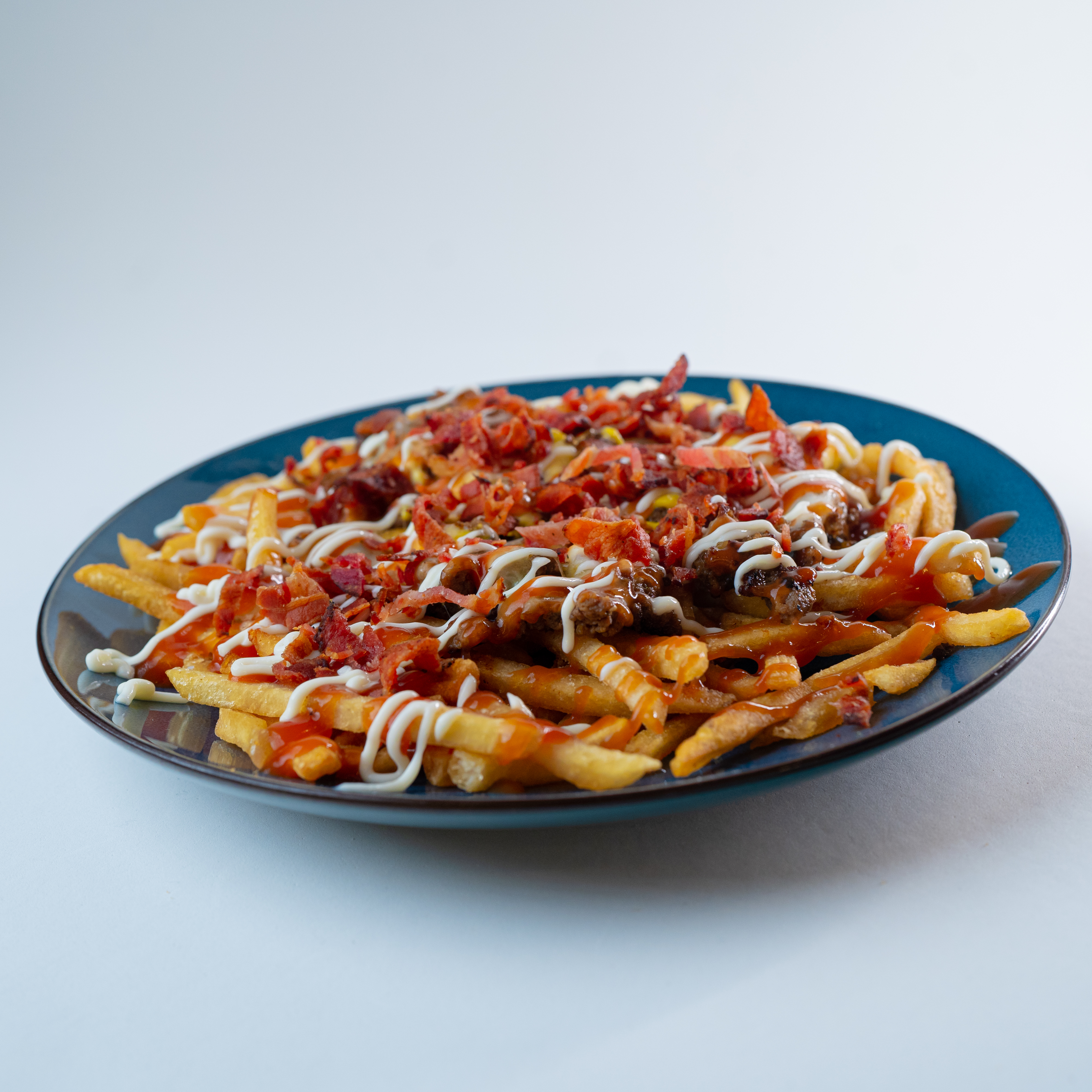 Tocino, carne artensal en trocitos,cebolla caramelizada, queso cheddar, kétchup y mayonesa.