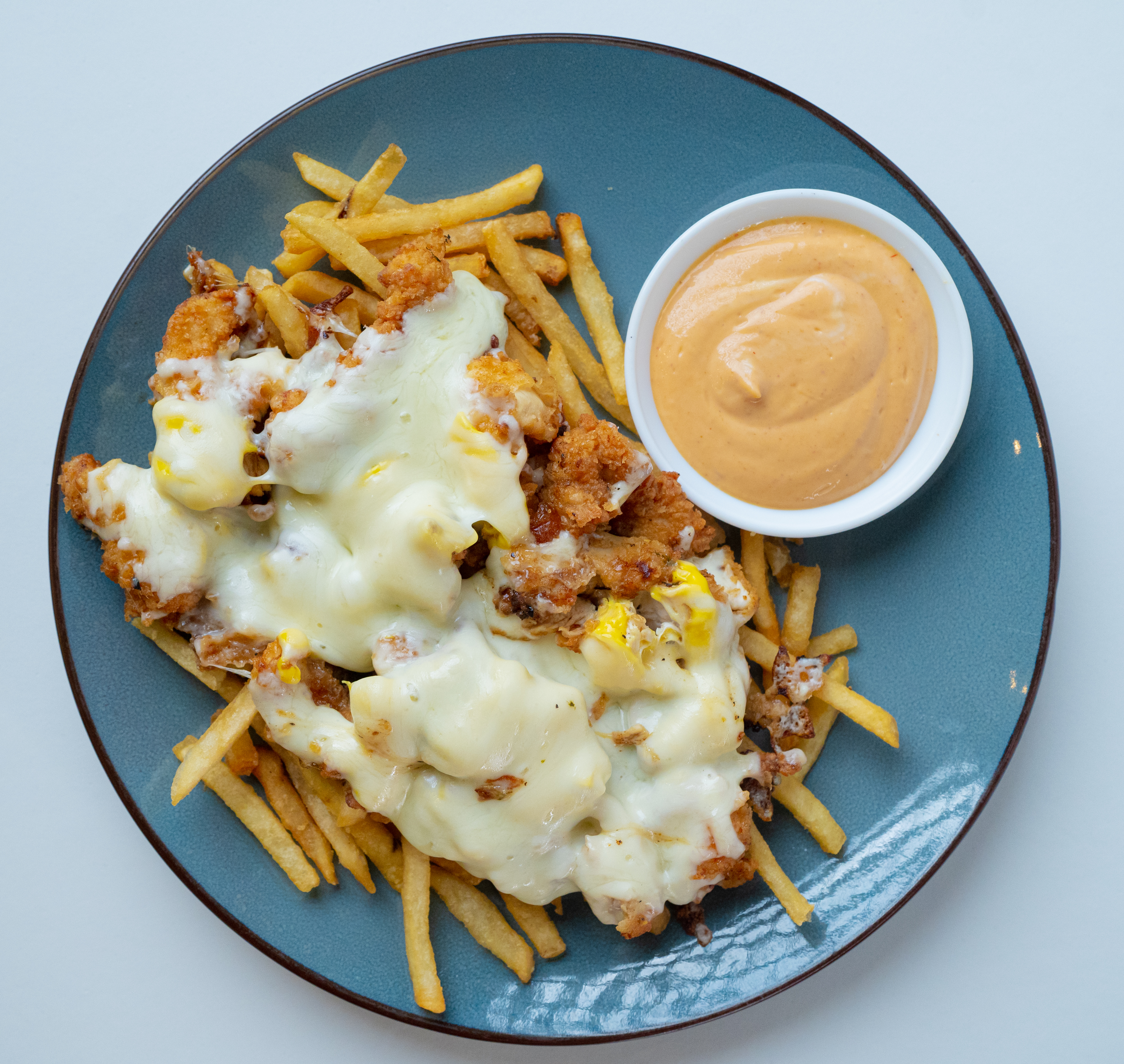 Filet de pollo rebanado, queso cheddar, cebolla caramelizada y salsa chipotle.