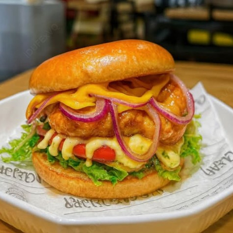 🌶️Pan brioche, lechuga, tomate, mayonesa, filet ¼ libra de pollo empanizado bañado en deliciosa salsa mango spicy, con queso amarillo , cebolla morada salteada y chiles jalapeño