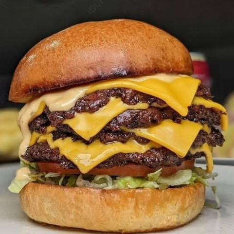 Triple torta de carne de res angus, queso americano, tomate , cebolla, lechuga , jamon, tocineta y pepinillos, salsa de tomate y mayonesa de la casa