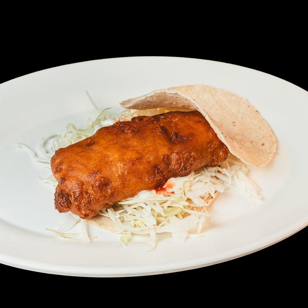 Tortilla grande tostada rellena de carne con repollo y salsas.