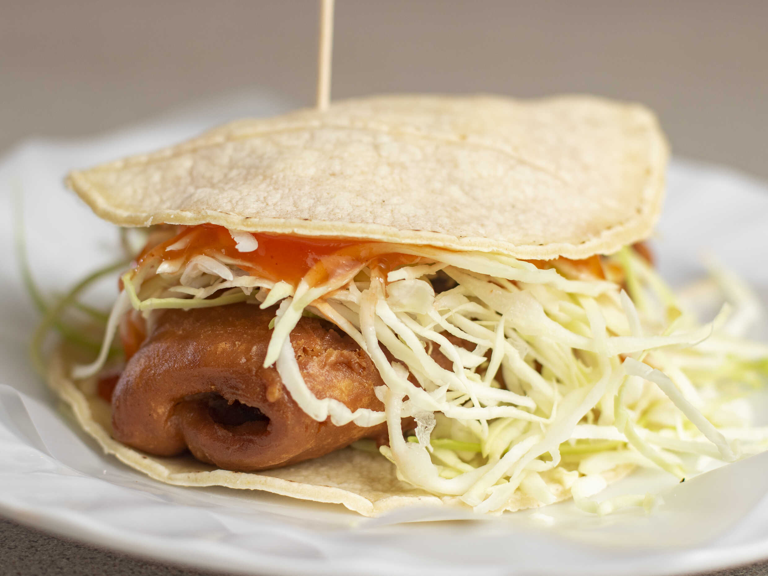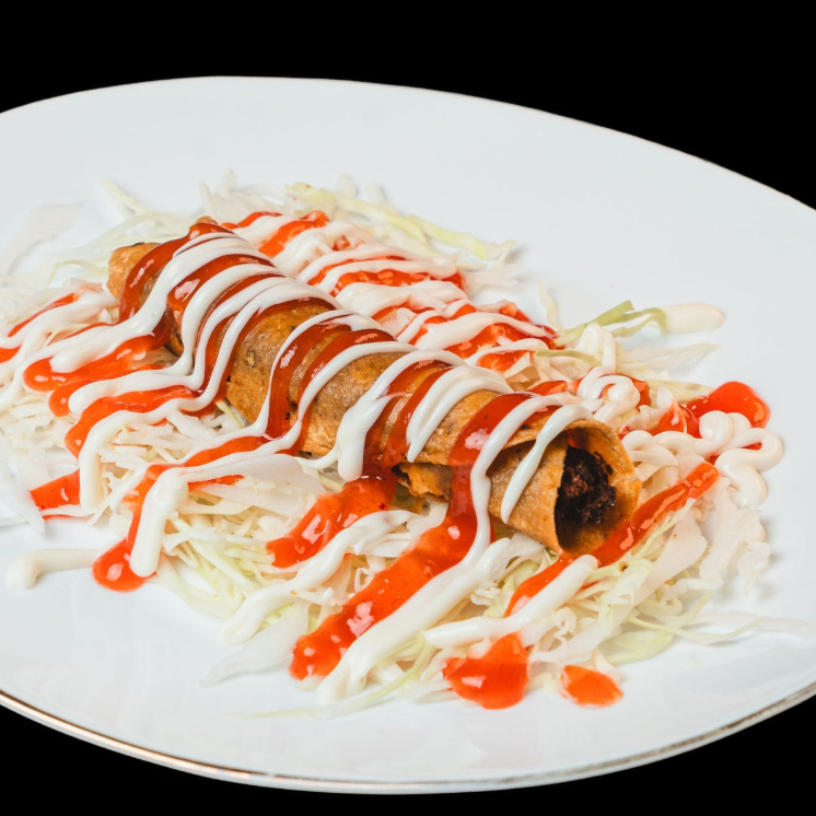 Tortilla grande tostada rellena de carne con repollo y salsas.