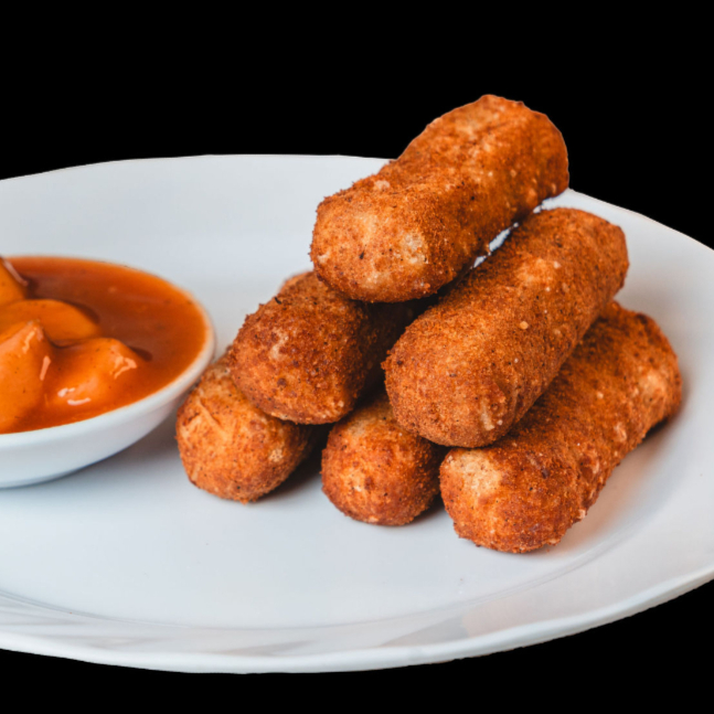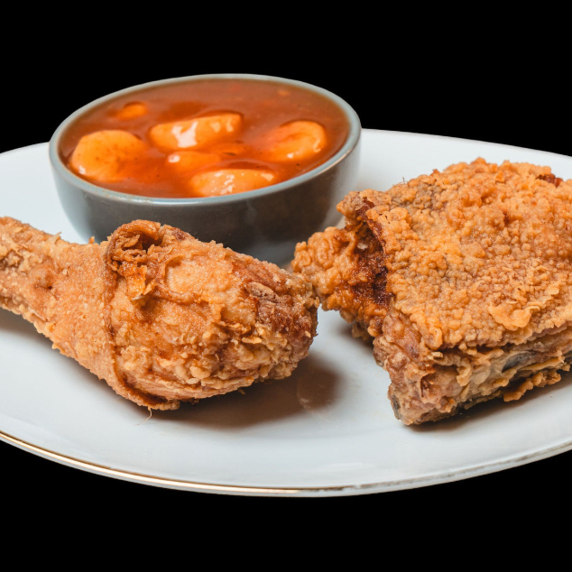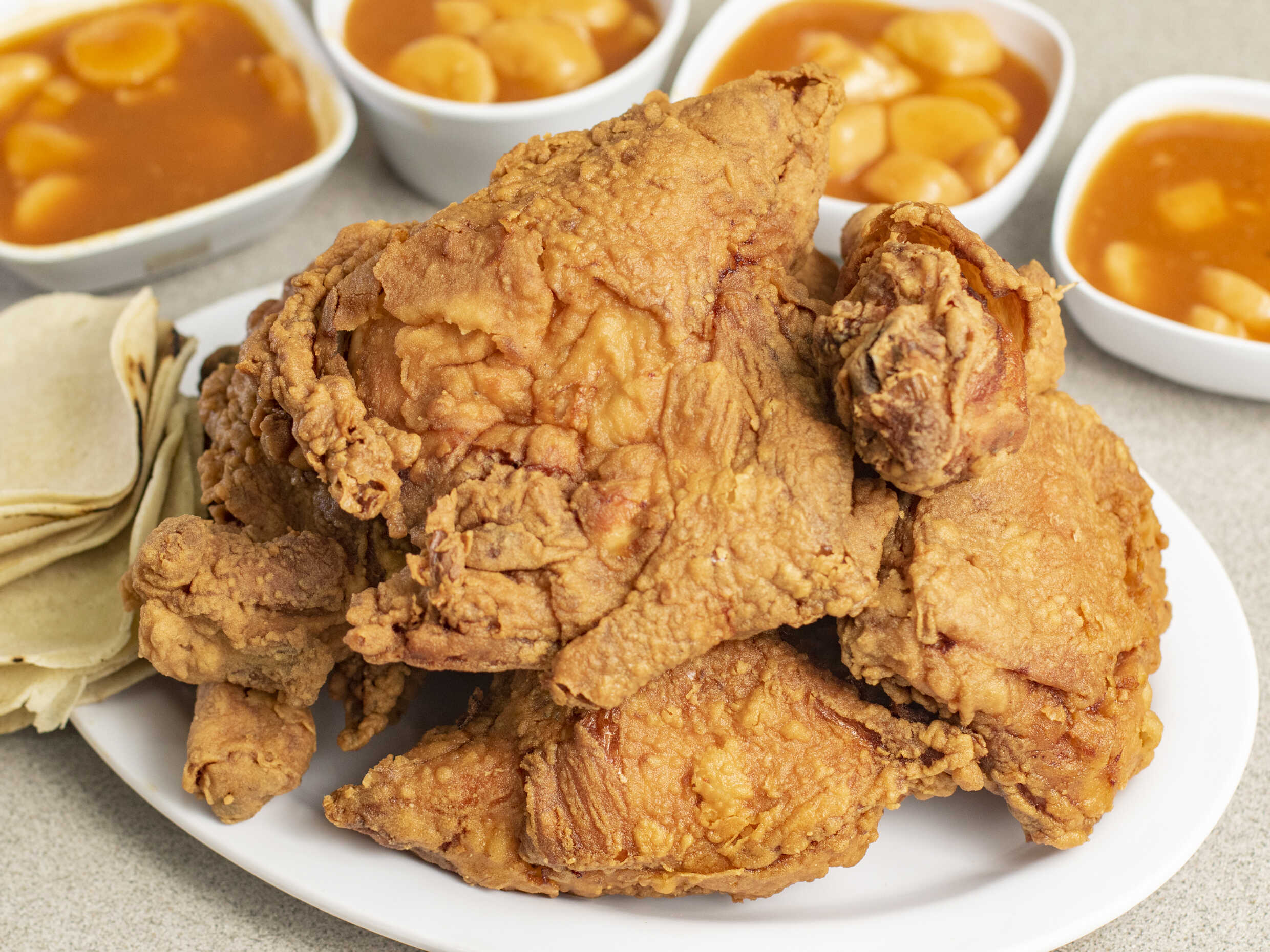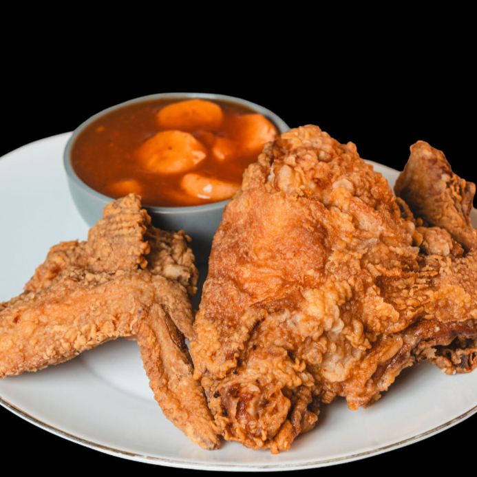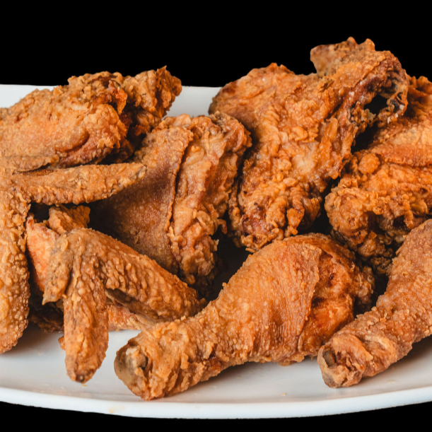 1 Pollo frito en 8 piezas con acompañado de ceviche de plátano y dos órdenes de papas fritas.