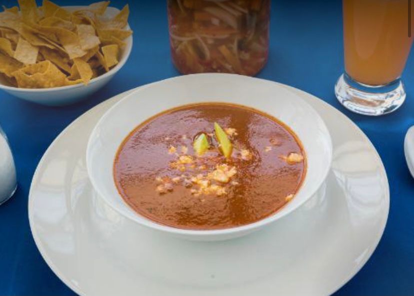 Deliciosa sopa a base de un fondo claro de pollo con tomates asados y especias. Acompañado de tortillitas.