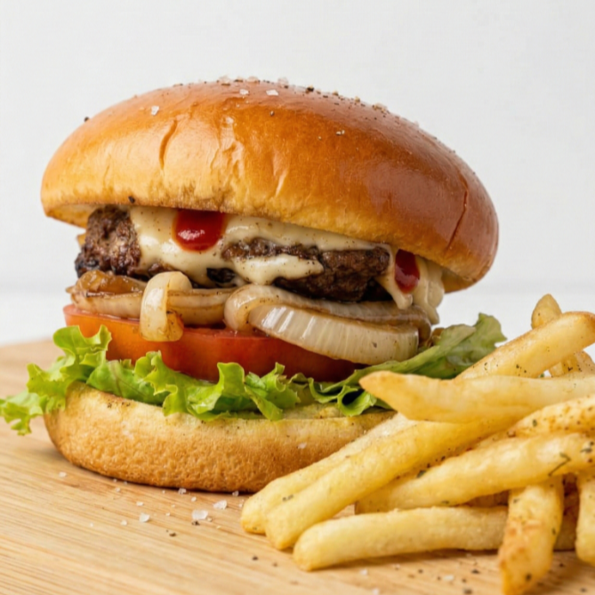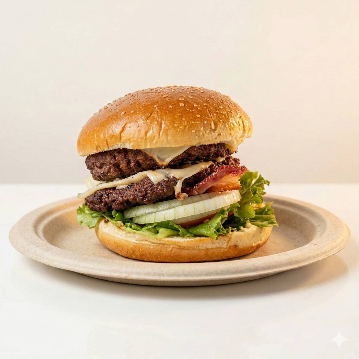Doble torta, tocineta, queso, lechuga, cebolla caramelizada y tomate (incluye papas).