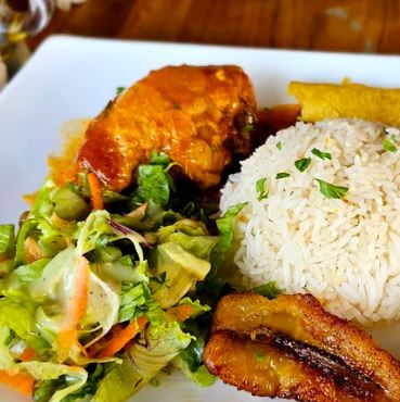 Delicioso casado con pollo en salsa ( Cadera de pollo, arroz, frijoles, ensalda y platano maduro)