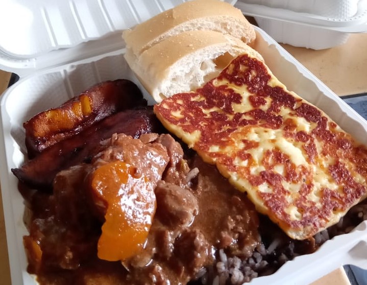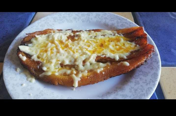 Pinto Con Carne en Salsa, queso y platanos .