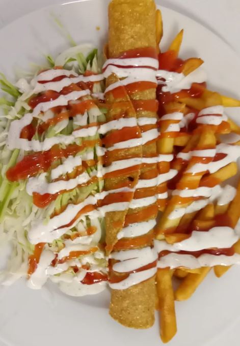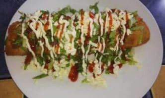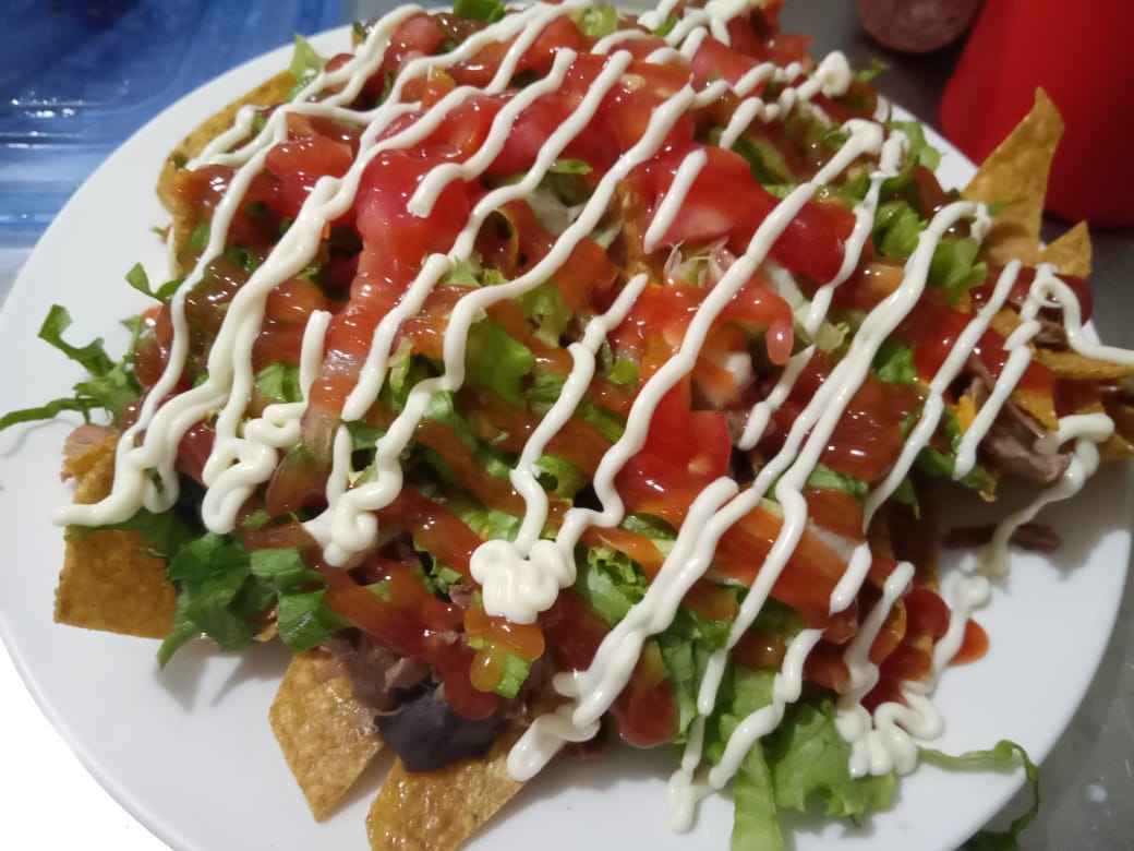 Tortilla de harina con carne desmechada, queso, frijoles, lechuga y salsas.