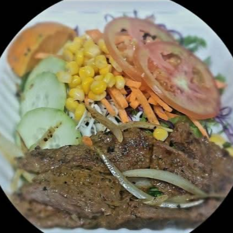 Ensalada verde, papas a la francesa, bistec en fajita (encebollado).