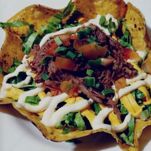 Una cama de lechuga, tortilla grande de maíz arrollada con carne mechada, a la que se le reposa frijoles molidos, salsa de queso, natilla, tomate picado, cebollín más papas a la francesa.