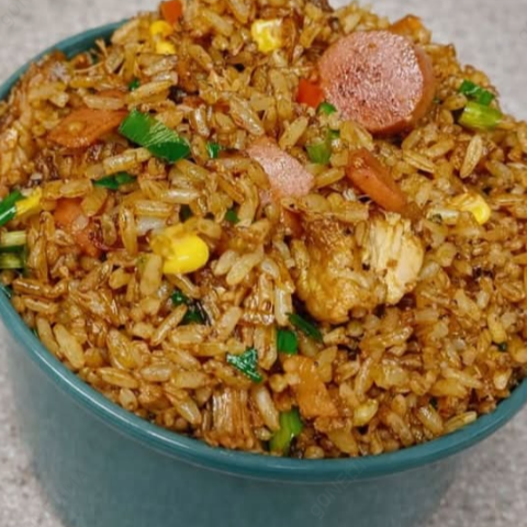 Carne de res, jamón, cebollín, chile dulce, maíz dulce, petit pois, azafrán, salsa china.