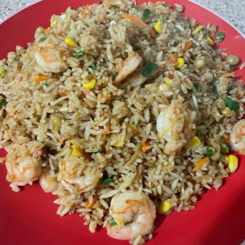 Camarones, cebollín, chile dulce, maíz dulce, petit pois, azafrán, salsa china. Contiene mariscos.