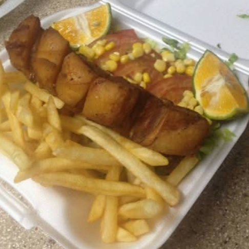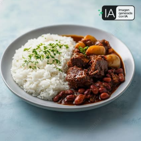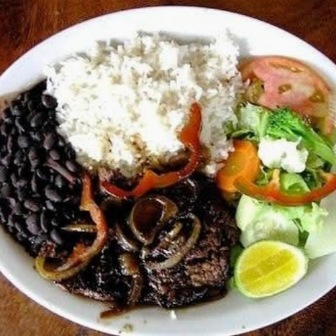 Arroz, frijoles rojos, ensalada verde, papas, maduro. Pollo, bistec, chuleta, pescado o carne de res en salsa. Contiene pescado.