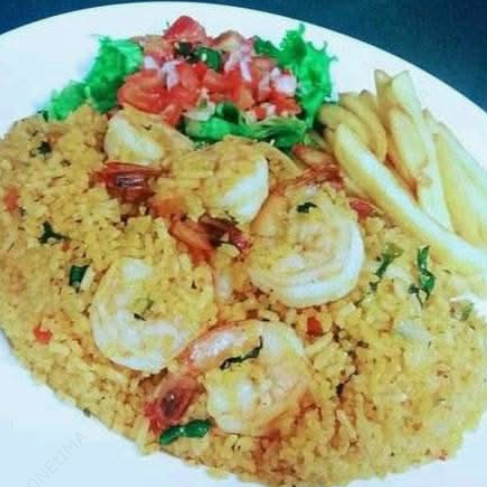 Arroz con Camarones Ensalada y Papas