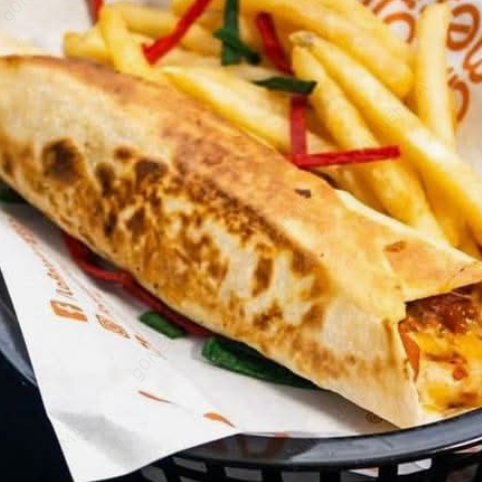 Tortilla de harina grande, pechuga de pollo a la plancha, frijoles molidos, lechuga, tomate, salsa de queso, natilla más papas a la francesa.
