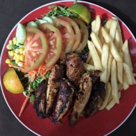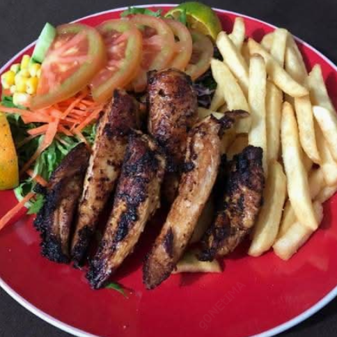 Ensalada verde, papas a la francesa, pechuga de pollo en fajitas (encebollado).