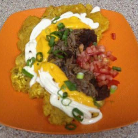 6 Patacones, carne mechada, frijoles molidos, salsa de queso, natilla, tomate picado y cebollín.