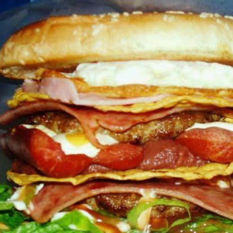 2 Tortas de carne casera, tocineta, jamón, lechuga, tomate, tortilla tostada, 2 salchichas, frijoles molidos, salsa de queso, natilla, salsa de tomate y mayonesa casera.