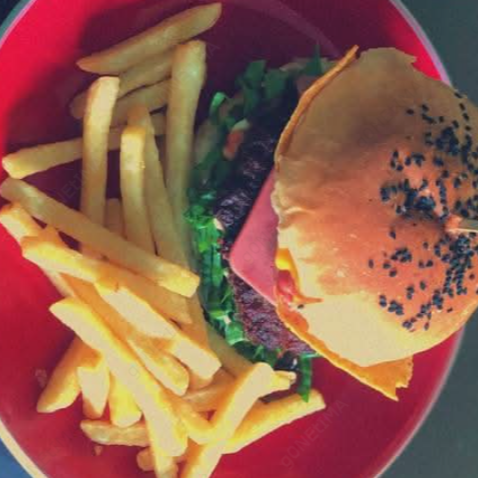 Torta de carne casera, lechuga, tomate, jamón, tajada de queso amarilla, salsa de tomate y mayonesa casera más papas a la francesa y salsa de tomate y mayonesa.