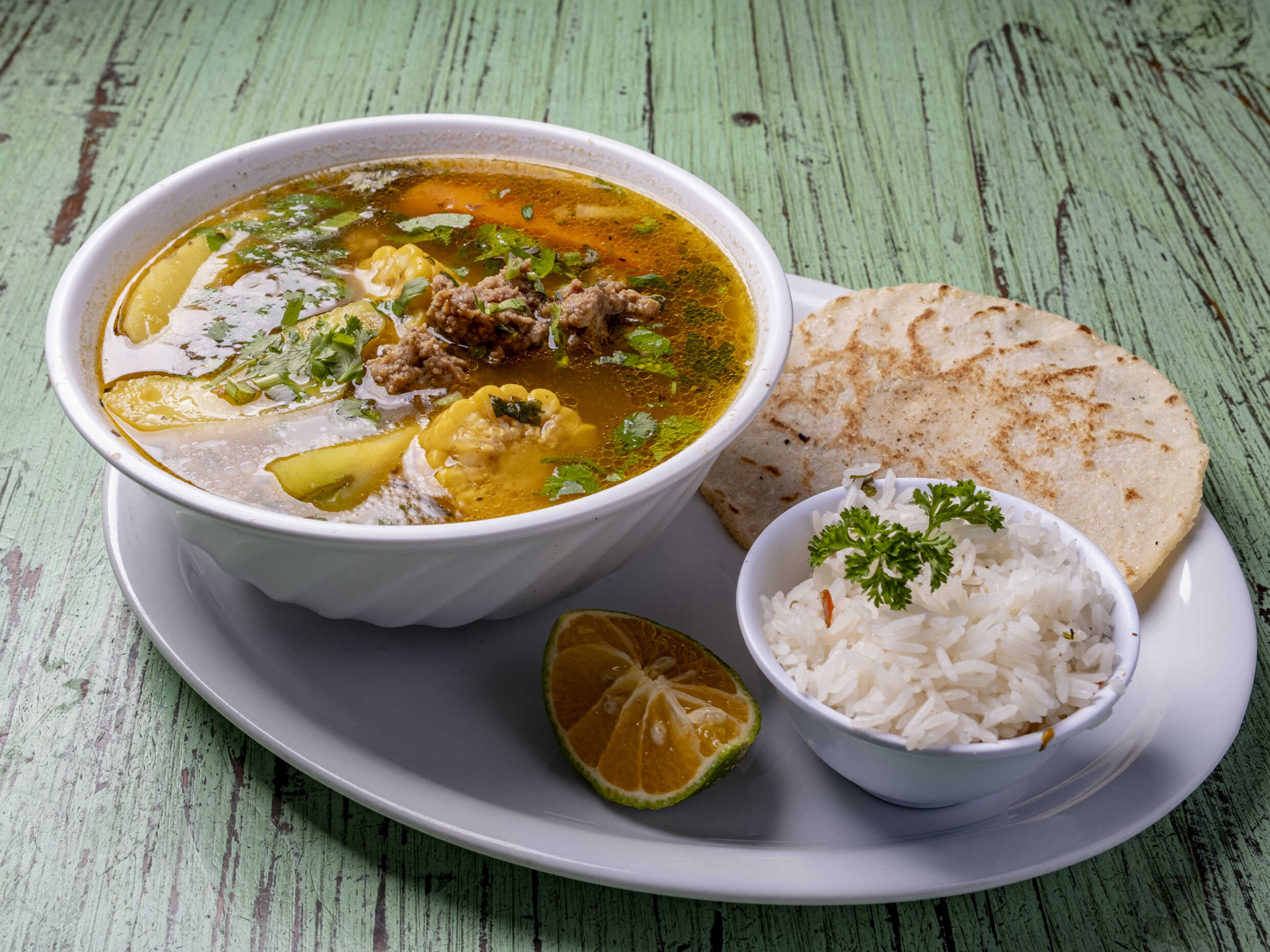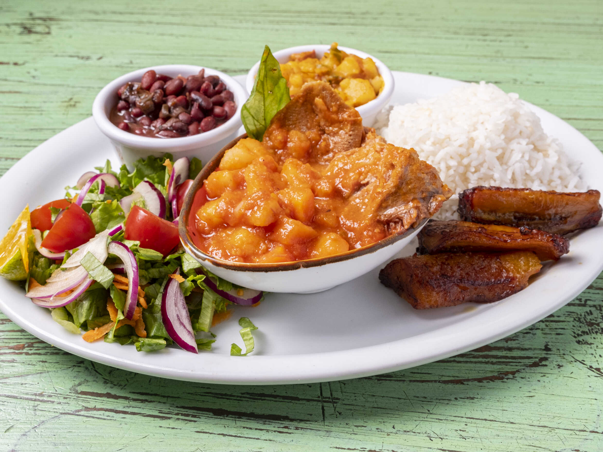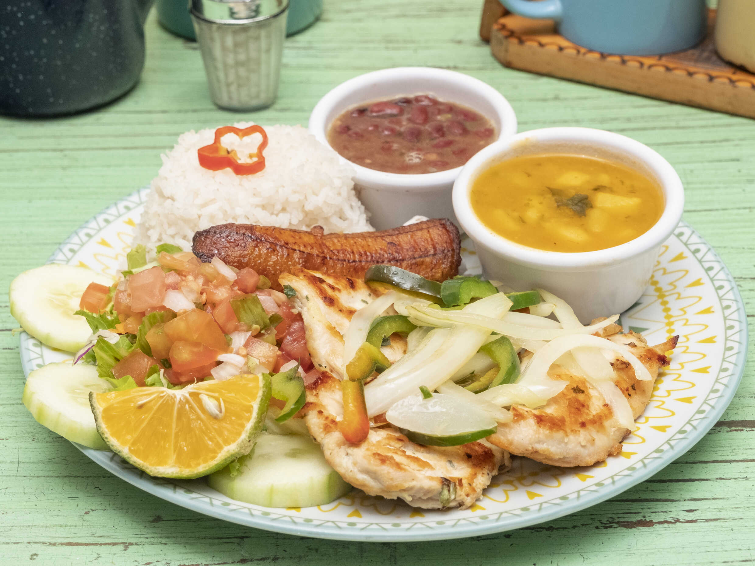 Arroz, frijoles, plátano maduro, ensalada verde, picadillo y proteína a elegir.