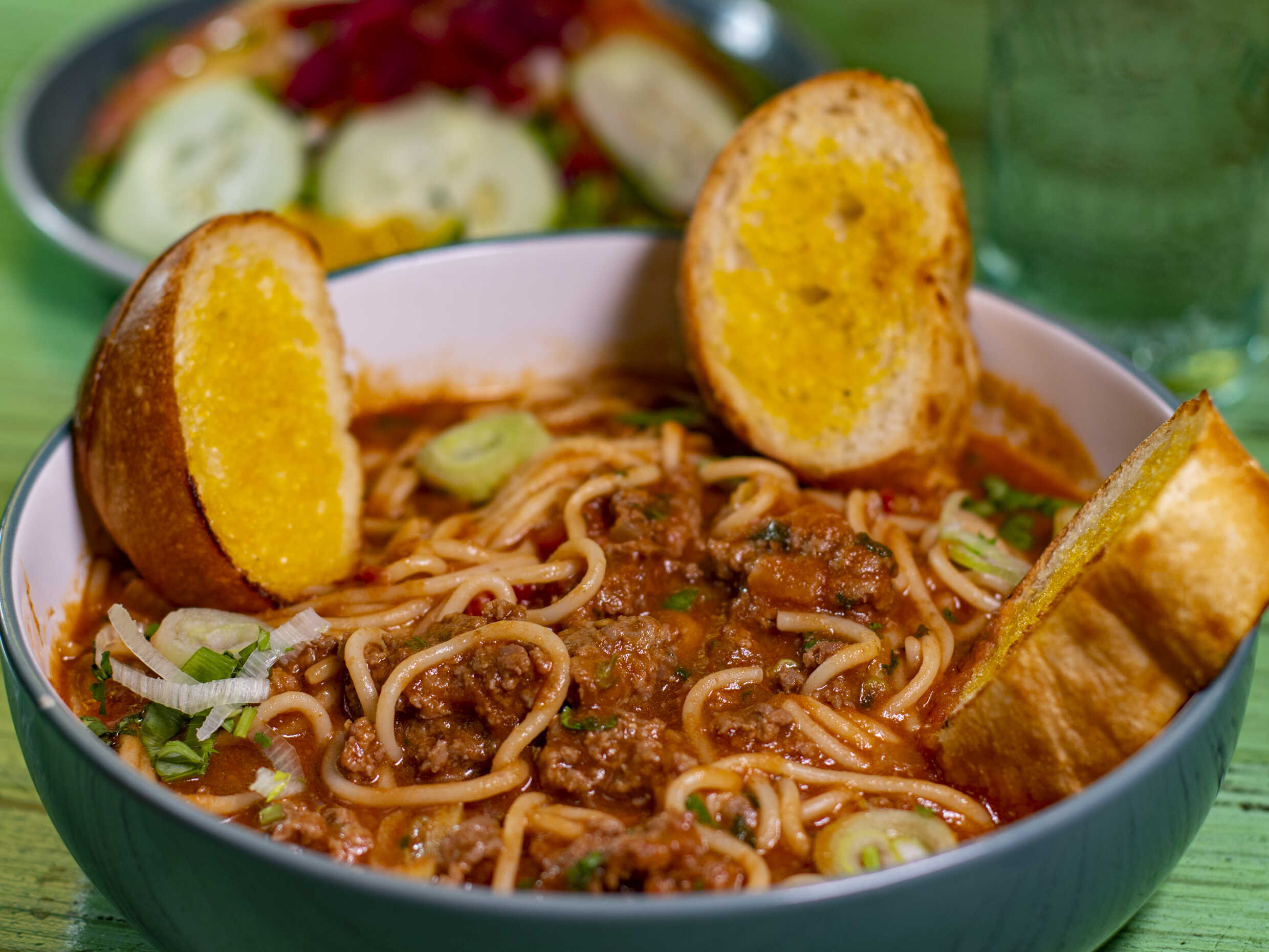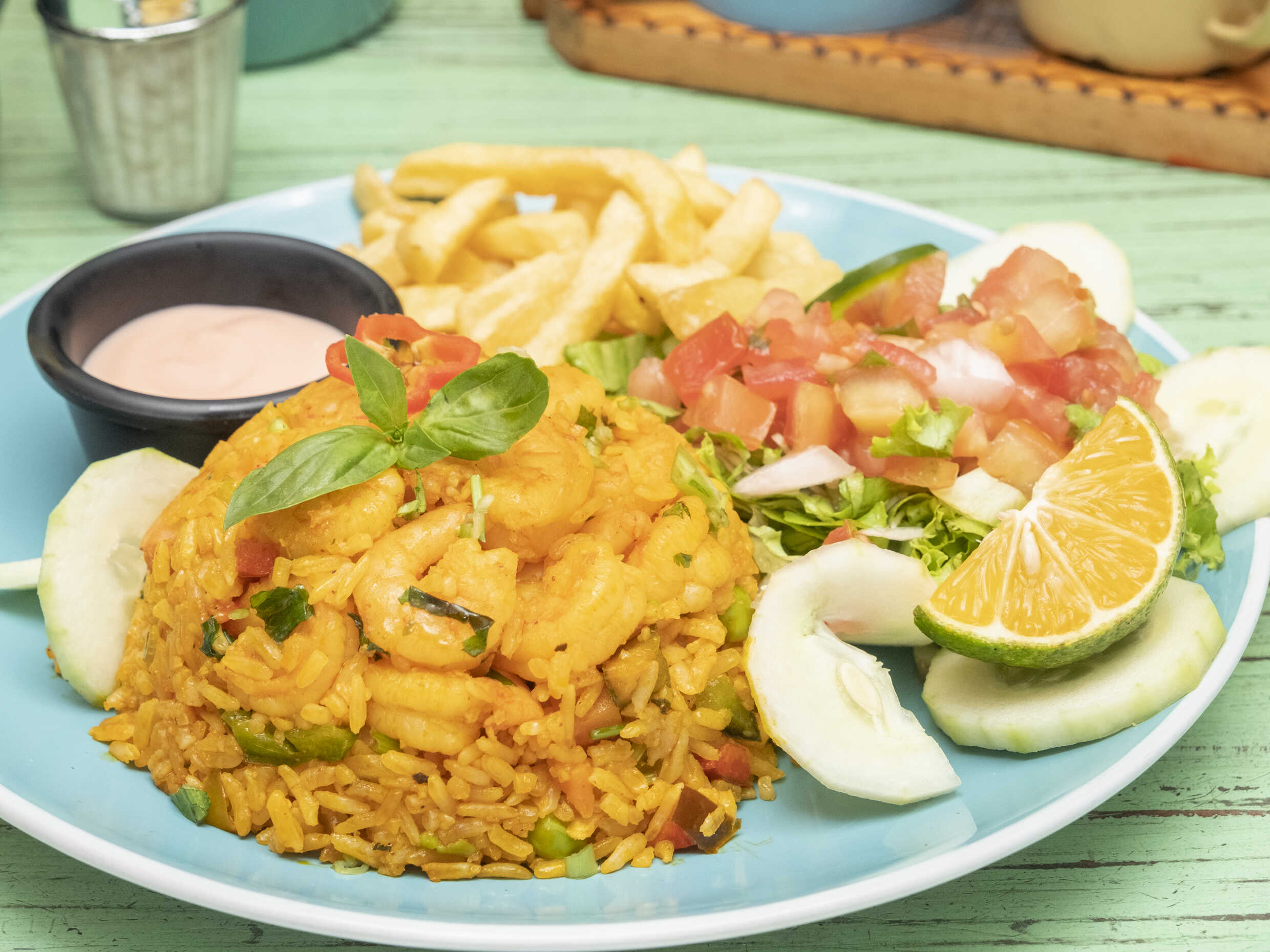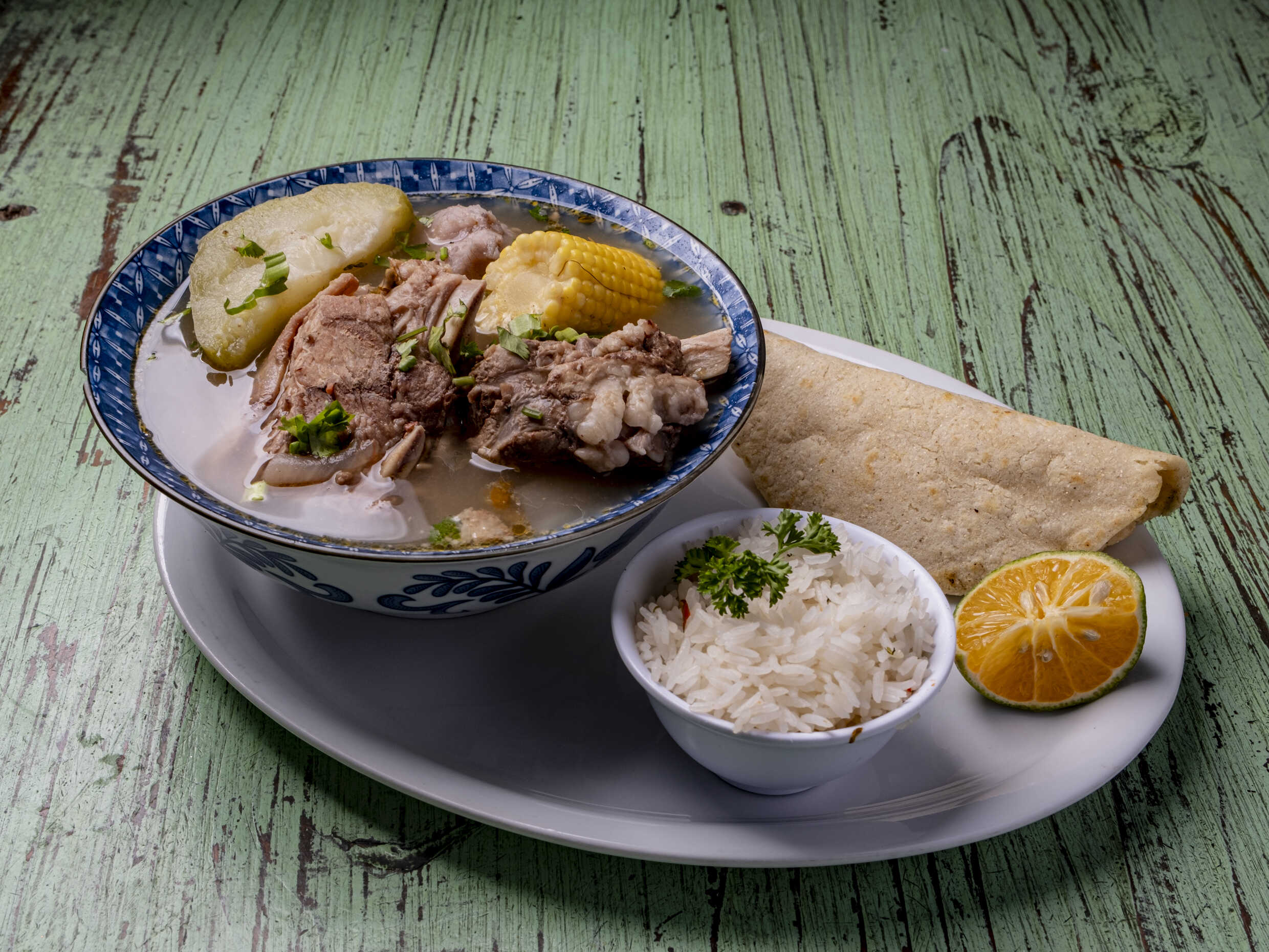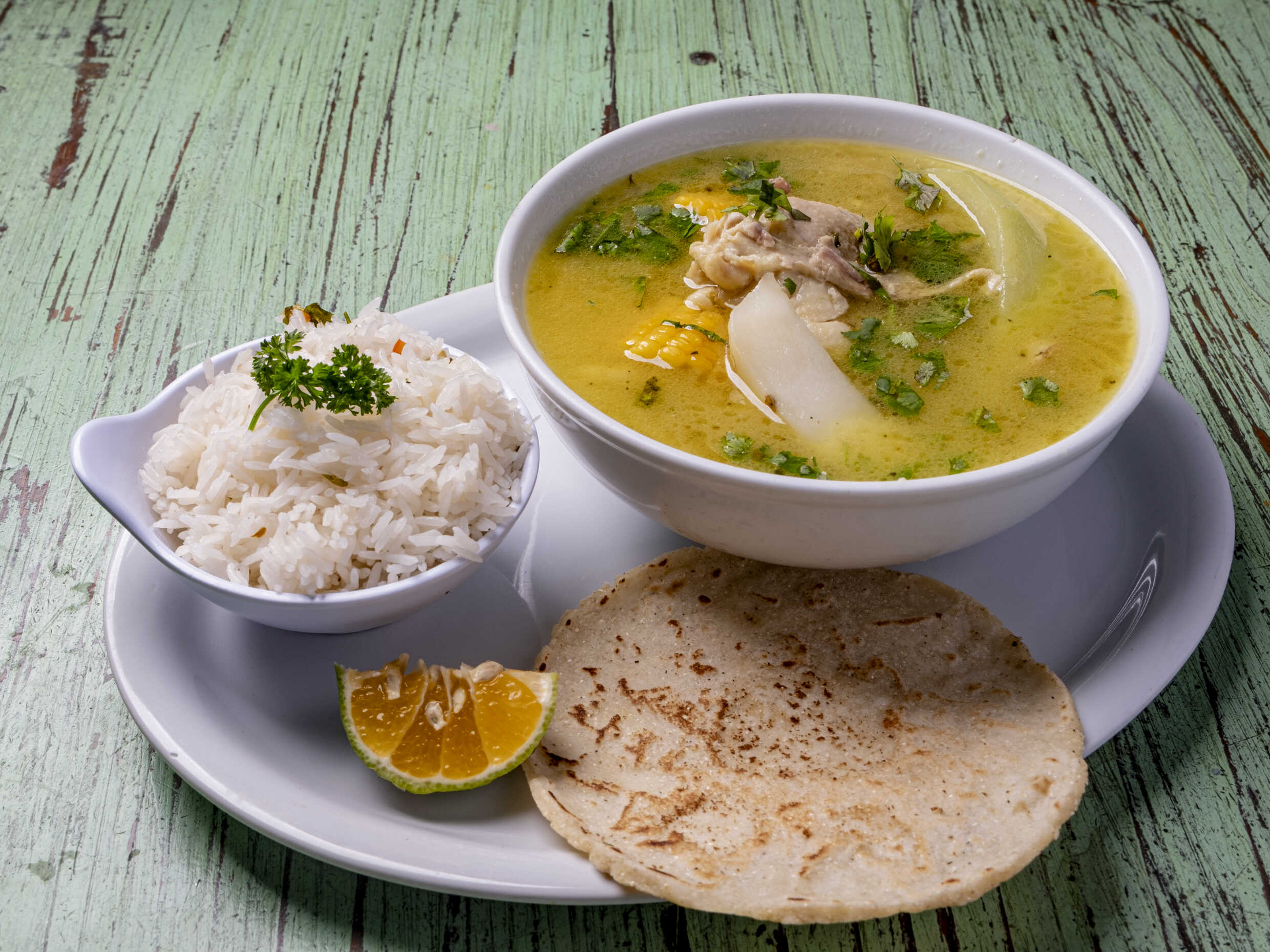Arroz, frijoles, plátano maduro, ensalada verde, picadillo y proteína a elegir.