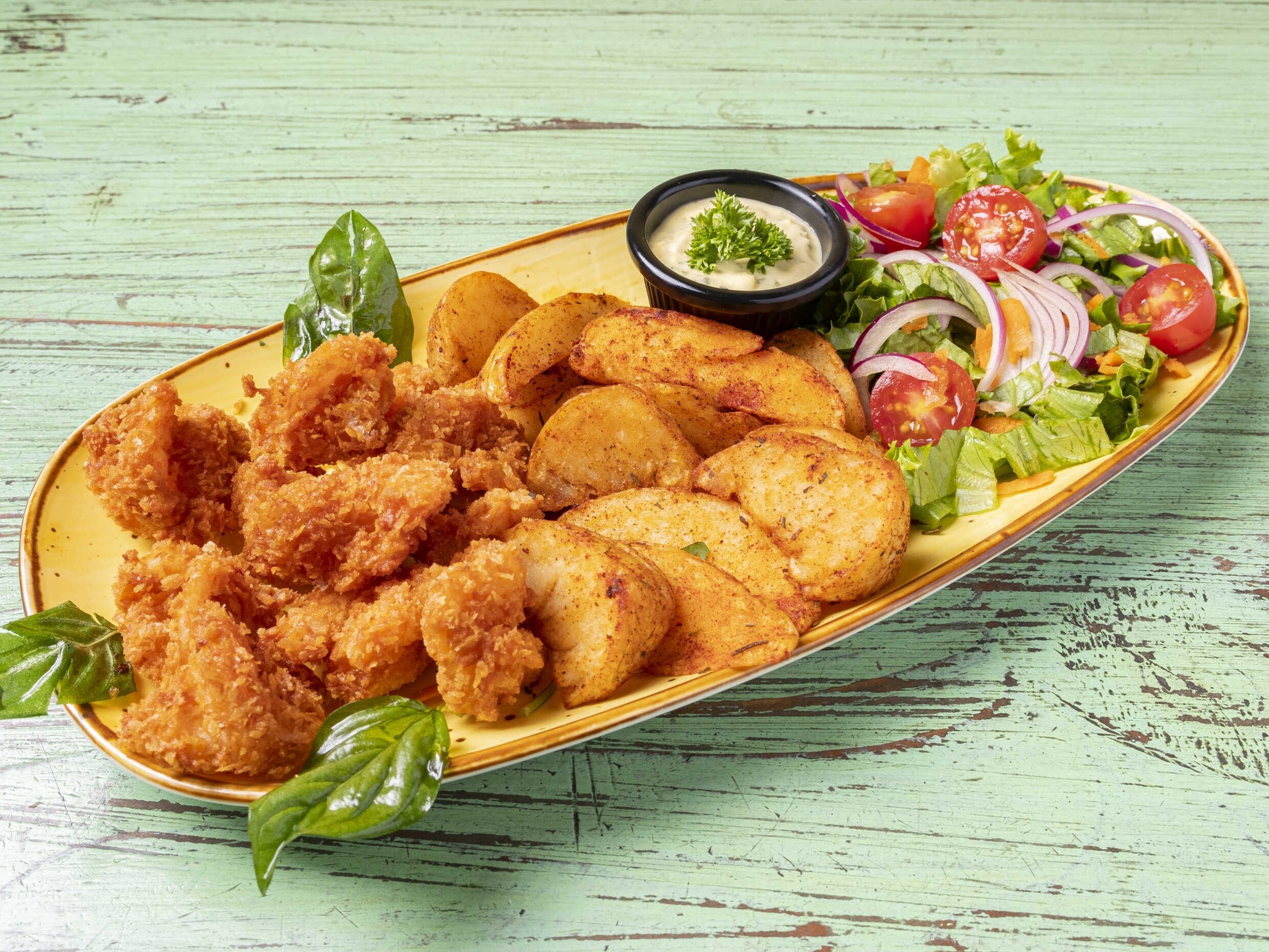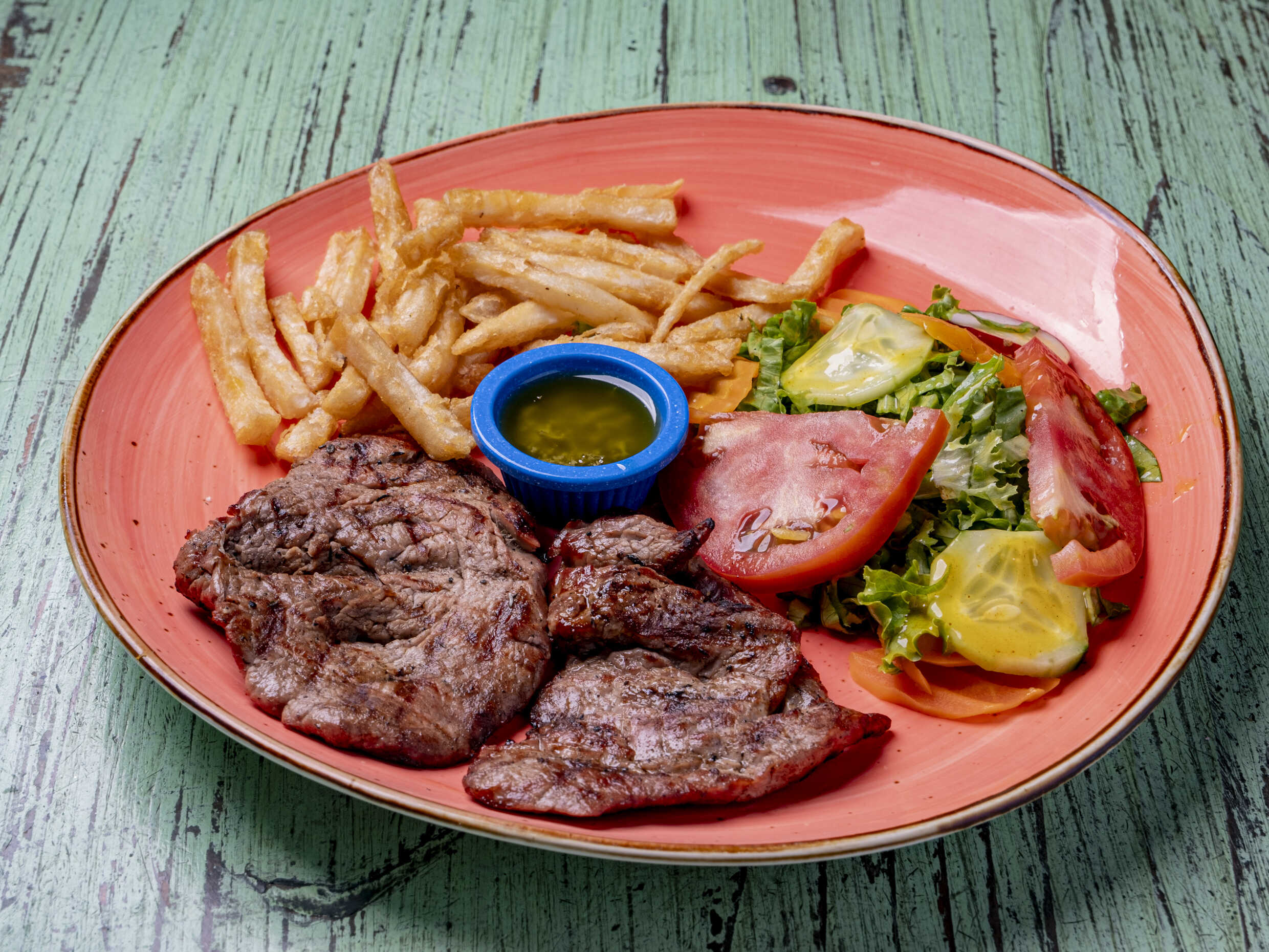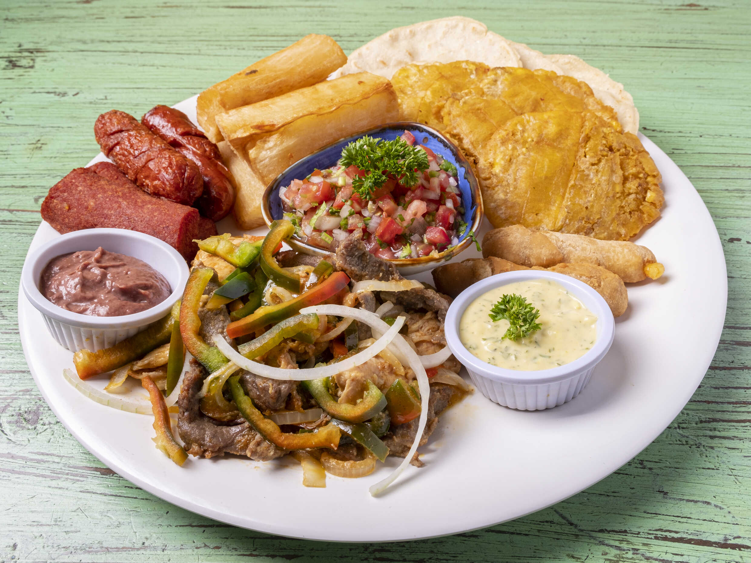 Fajitas de pollo, fajitas de res, chicharron, acompañados de patacones, palitos de queso, ensalada, yuca frita, frijoles y tortillas.