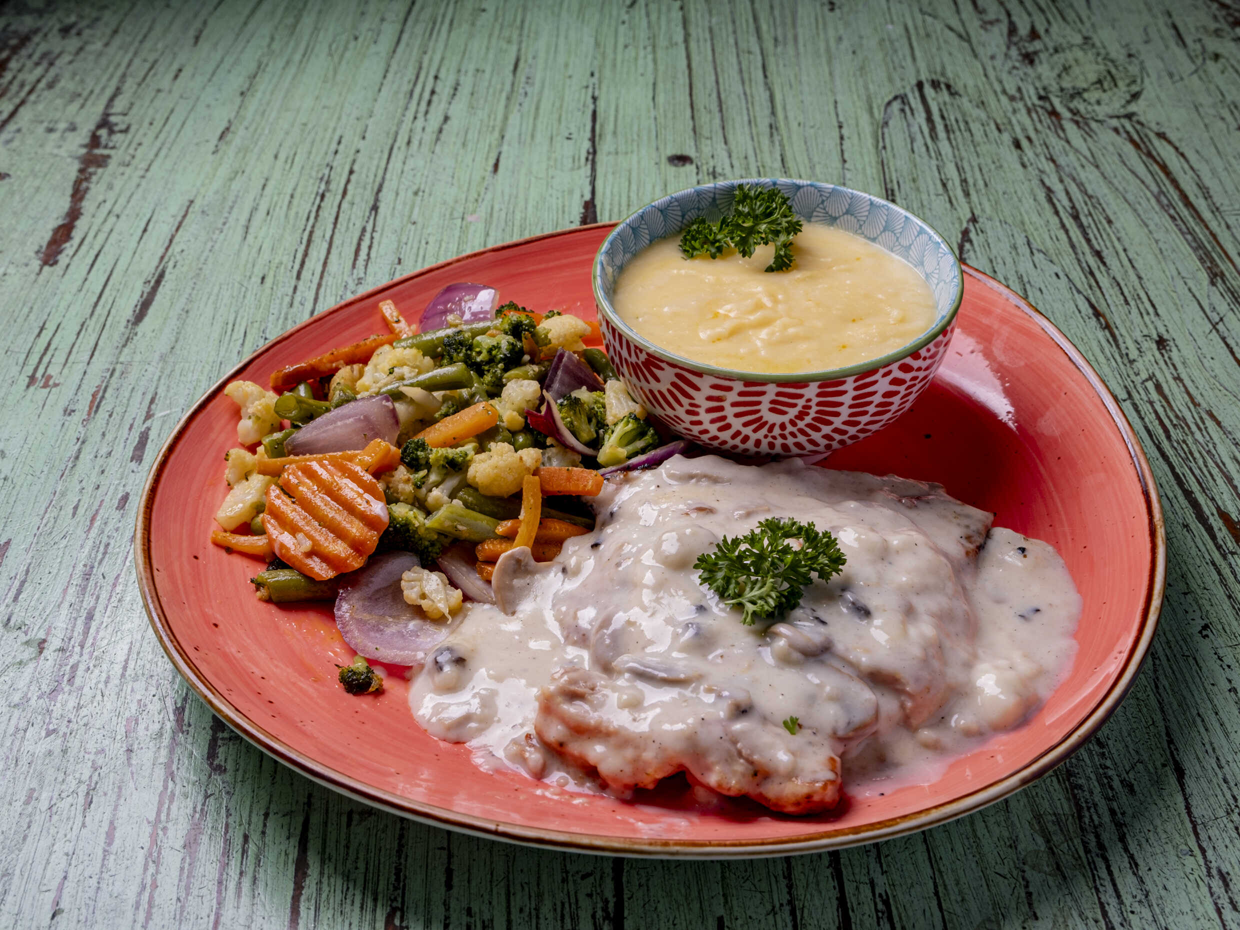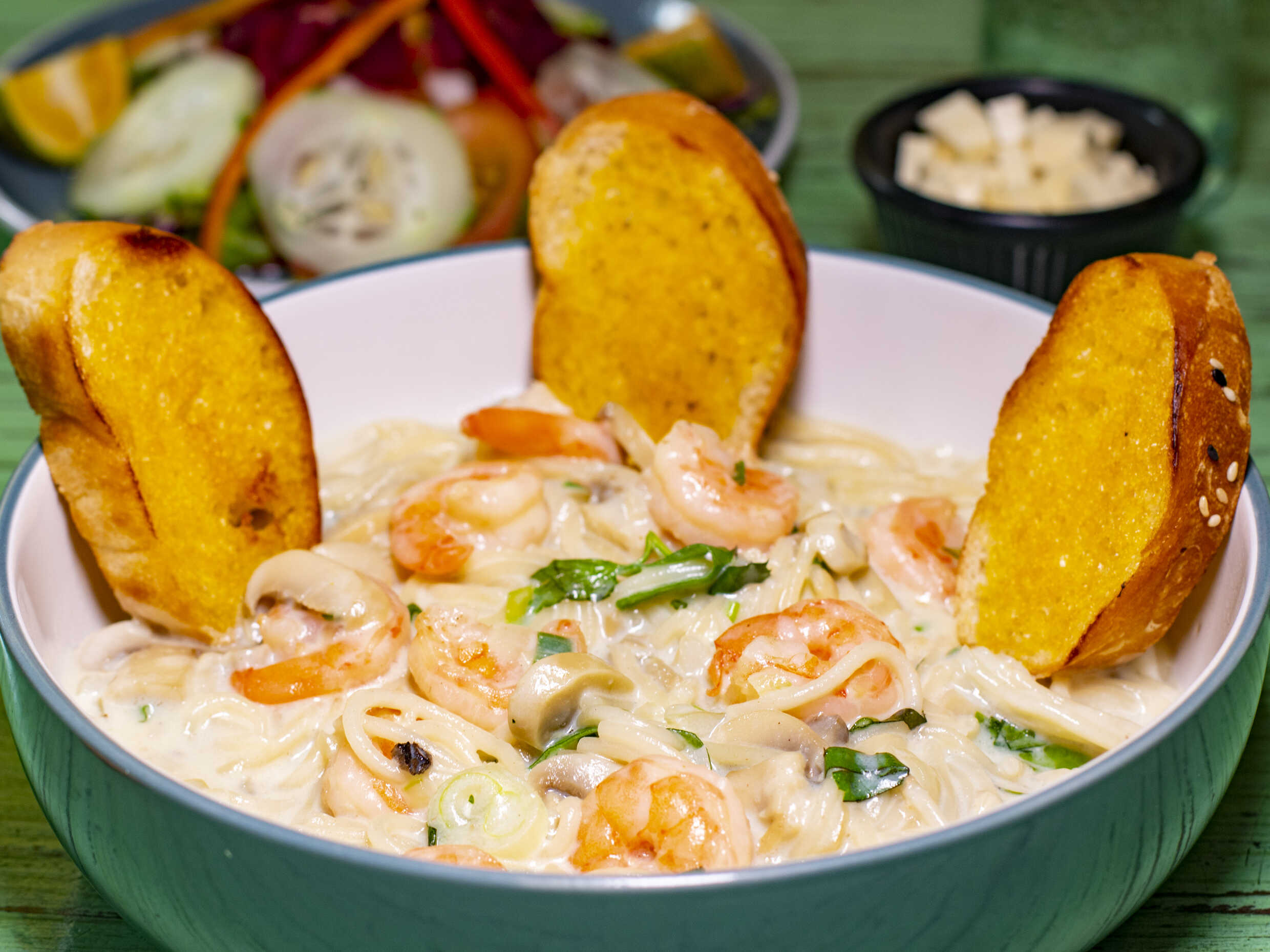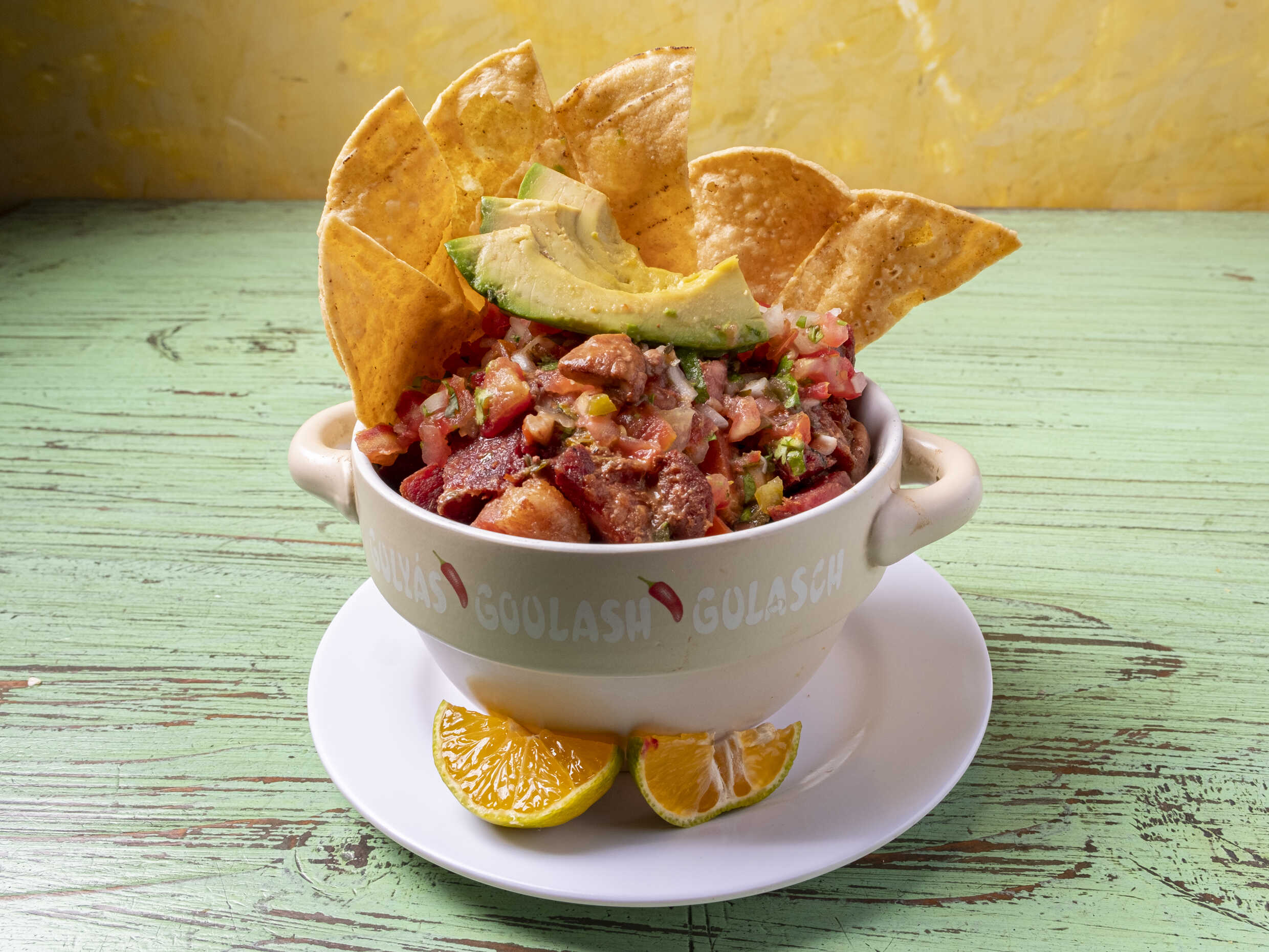 Fajitas de pollo, fajitas de res, chicharron, acompañados de patacones, palitos de queso, ensalada, yuca frita, frijoles y tortillas.