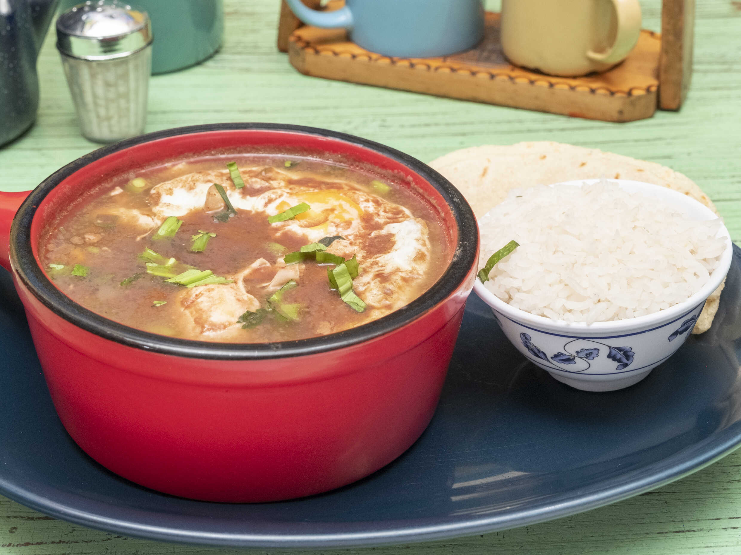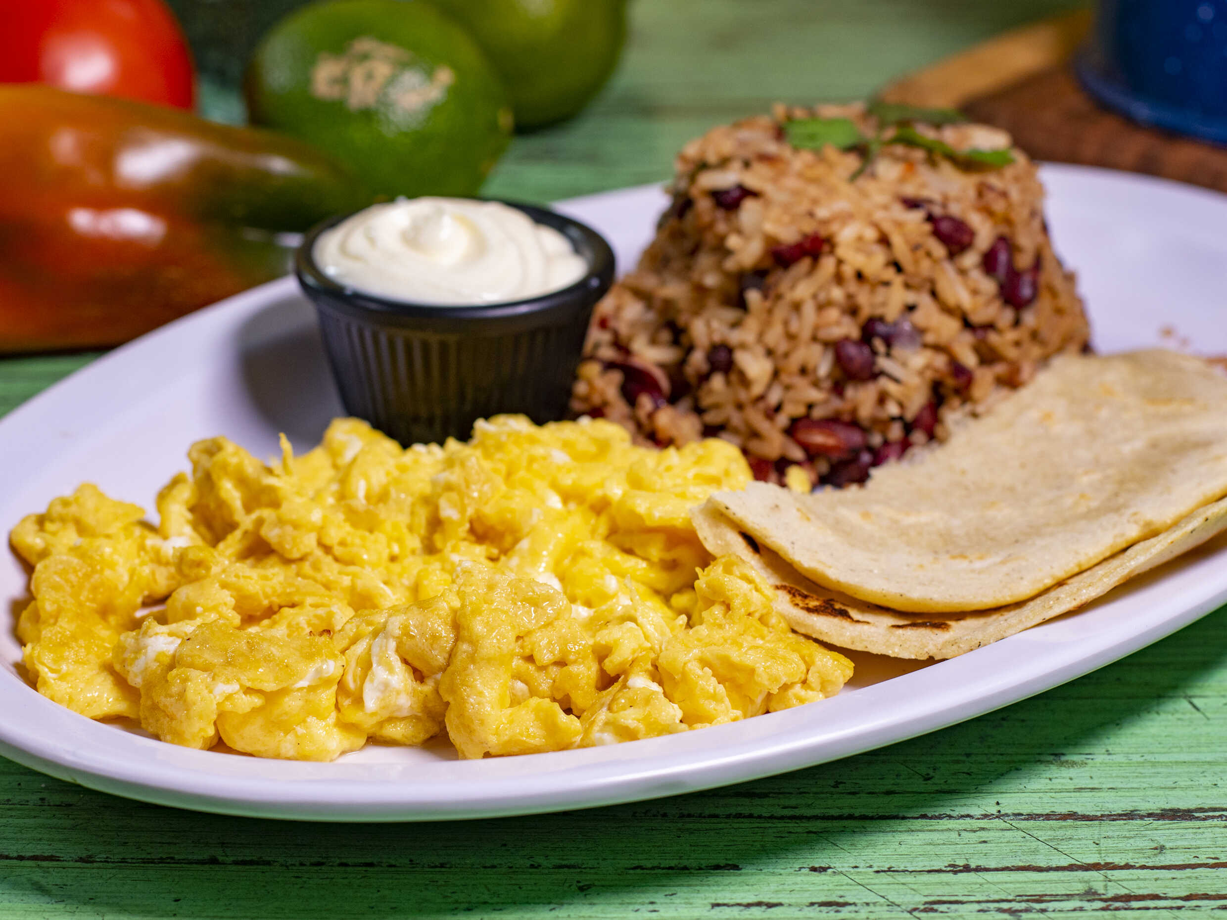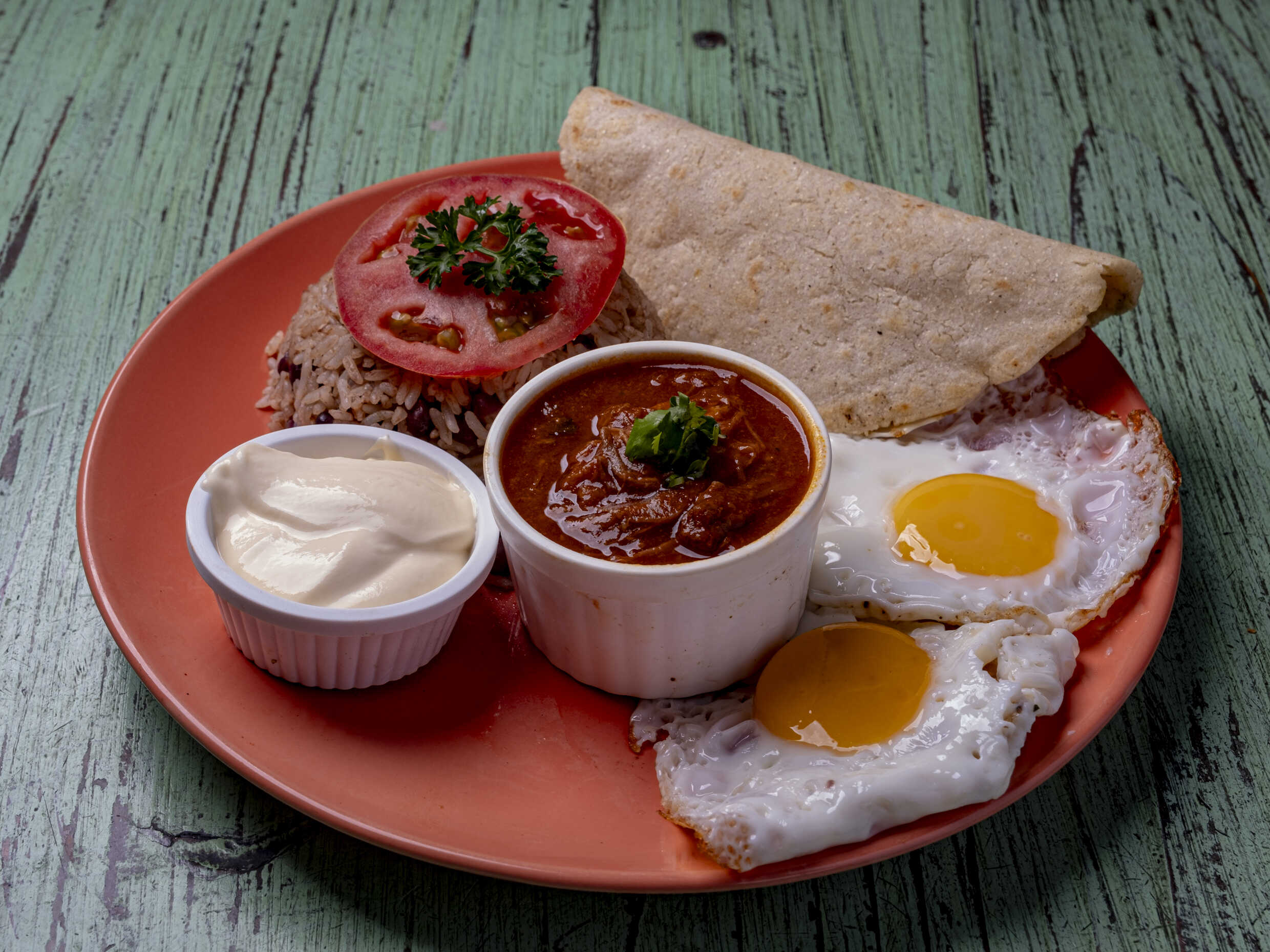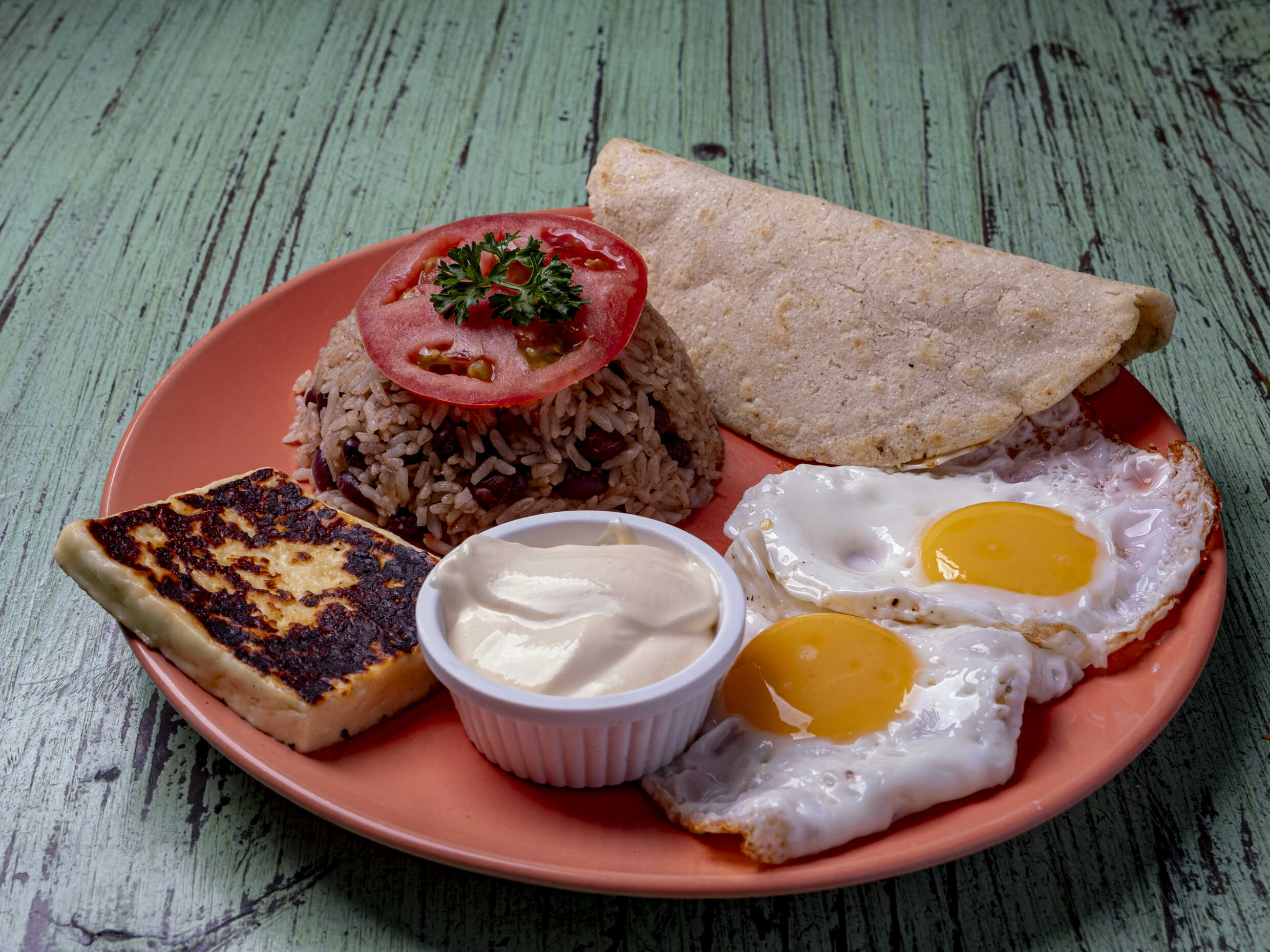 Gallo pinto, huevo, natilla, tortilla palmeada.