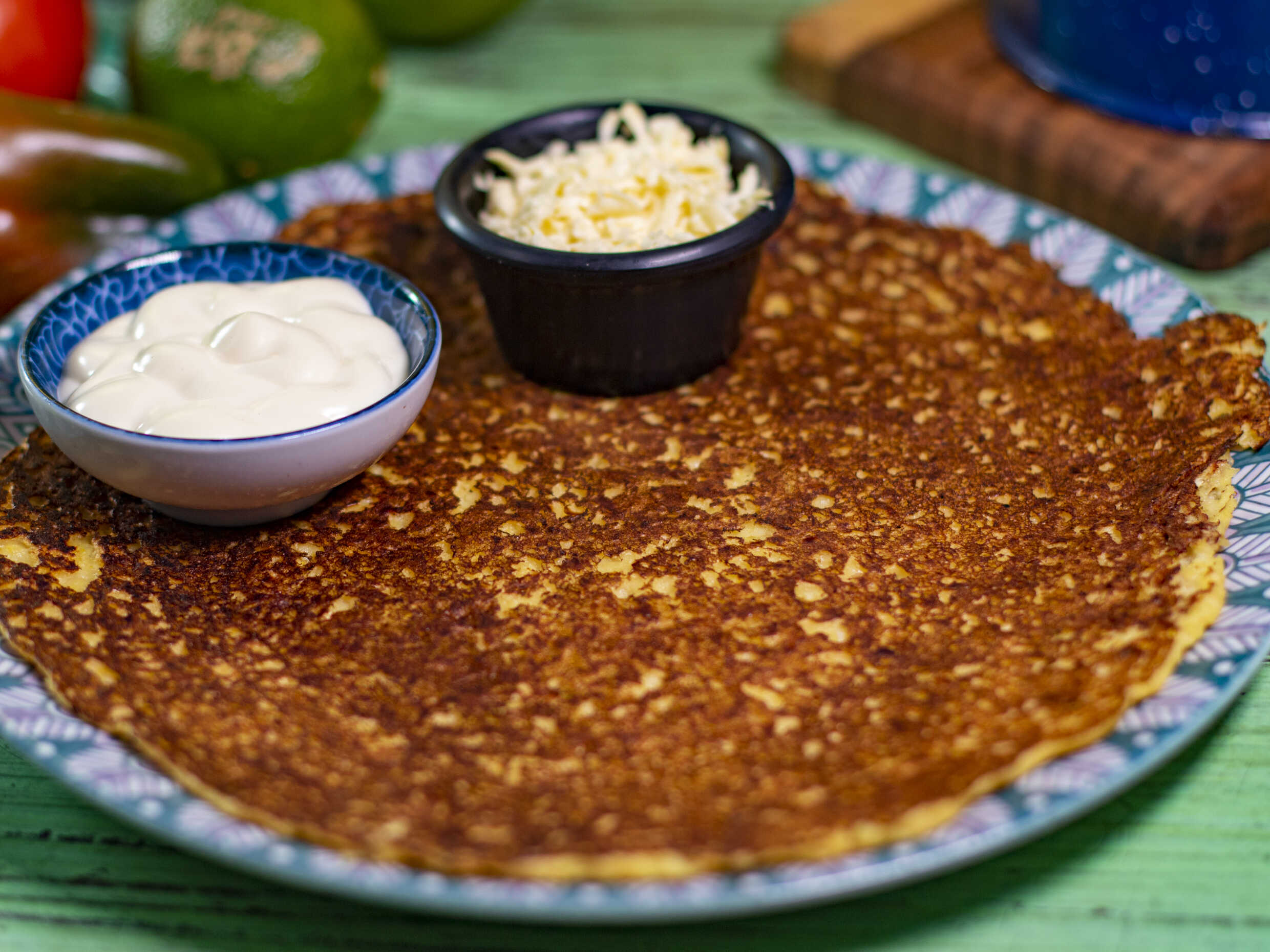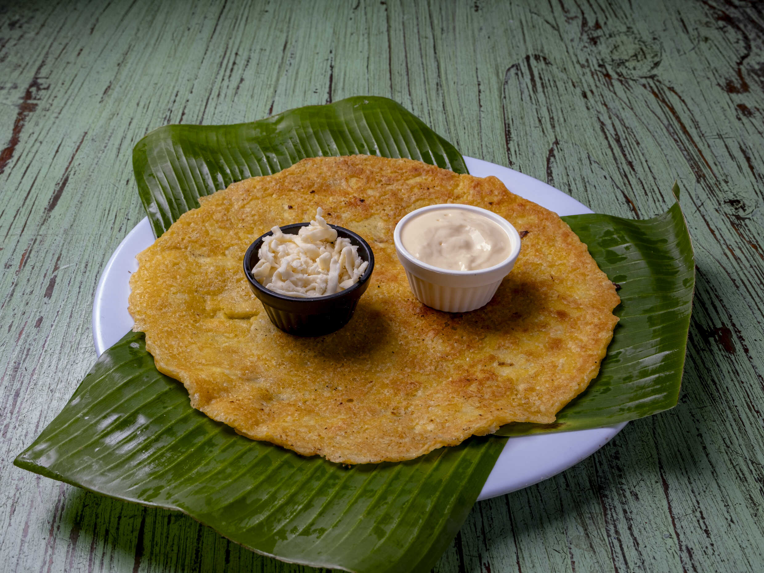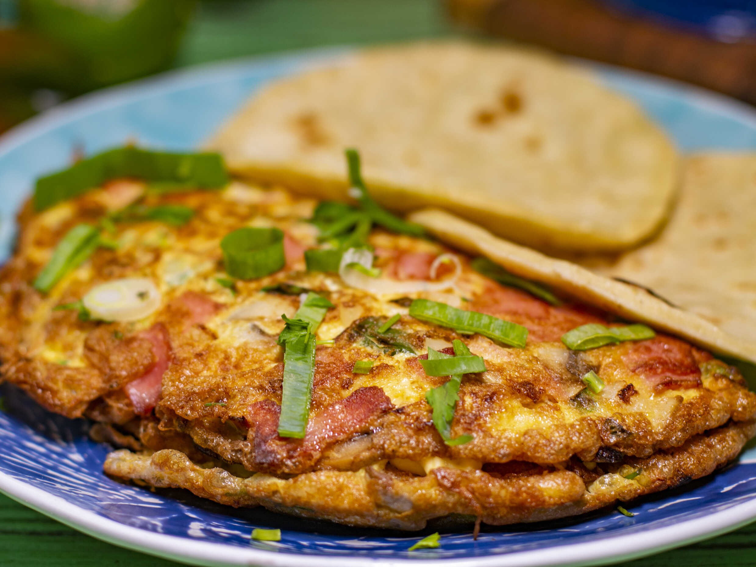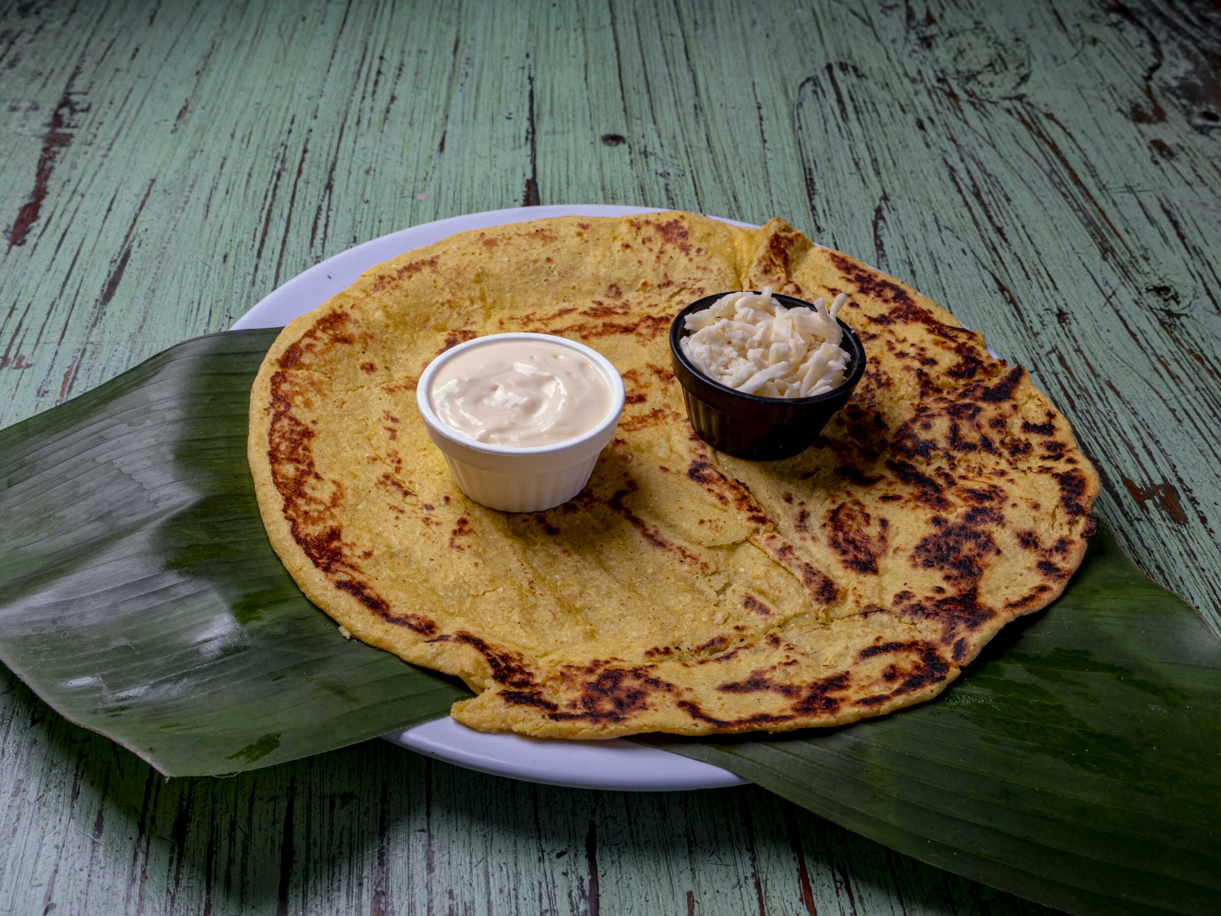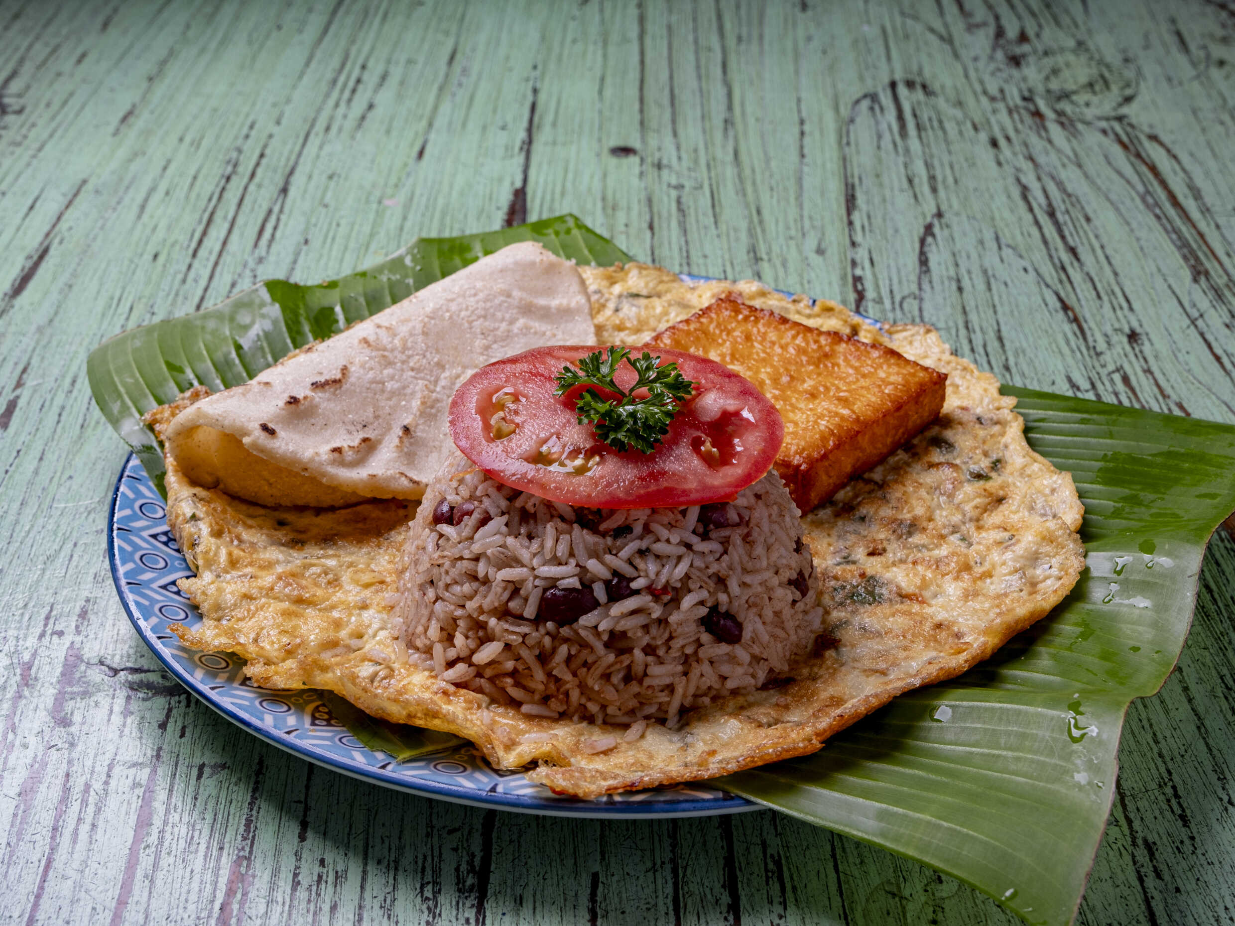 Gallo pinto, queso a la plancha sobre una torta de huevo, tortilla palmeada.