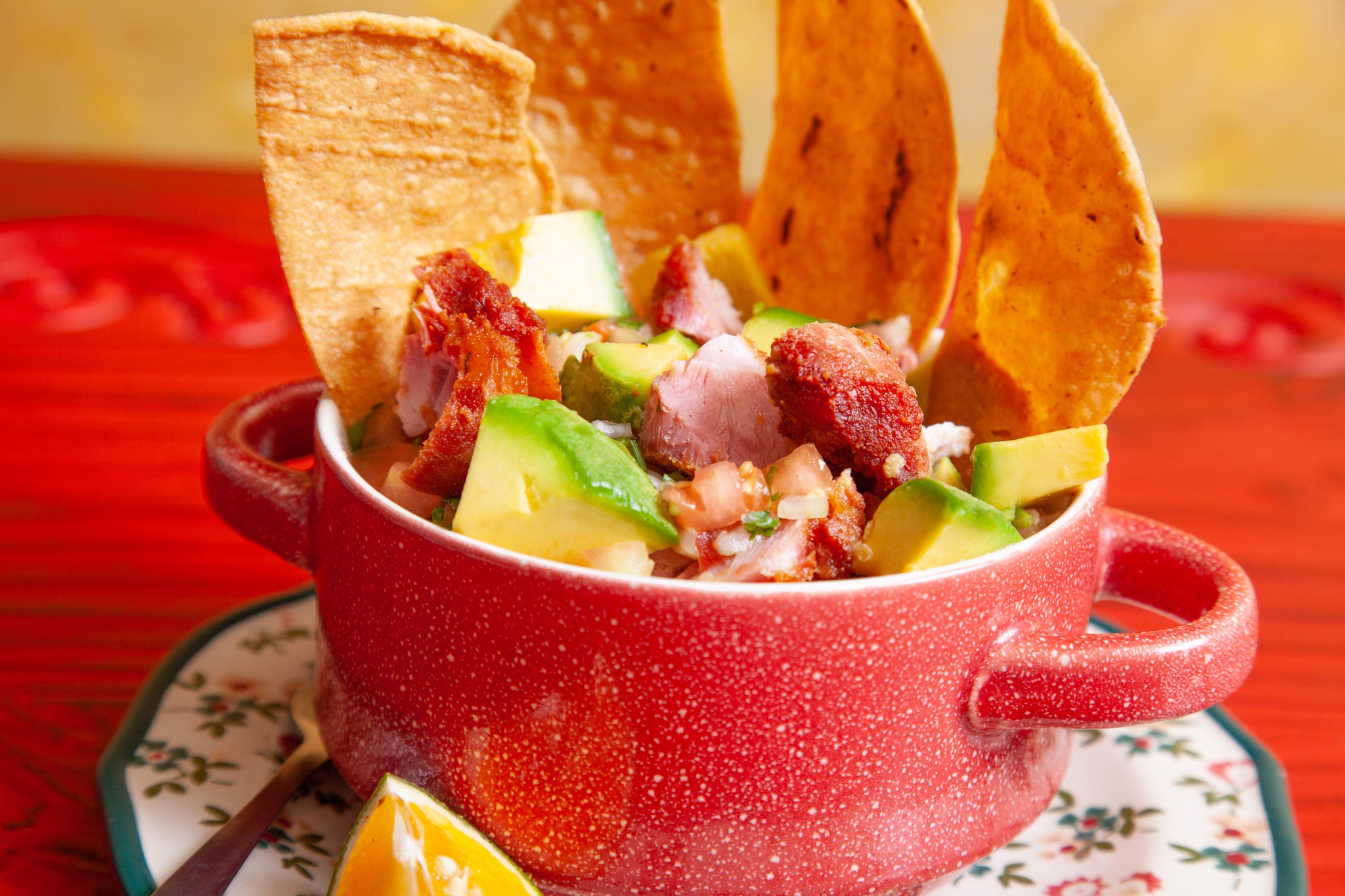 Arroz, frijoles tiernos, chicharrón, pico de gallo y tortillas chips.