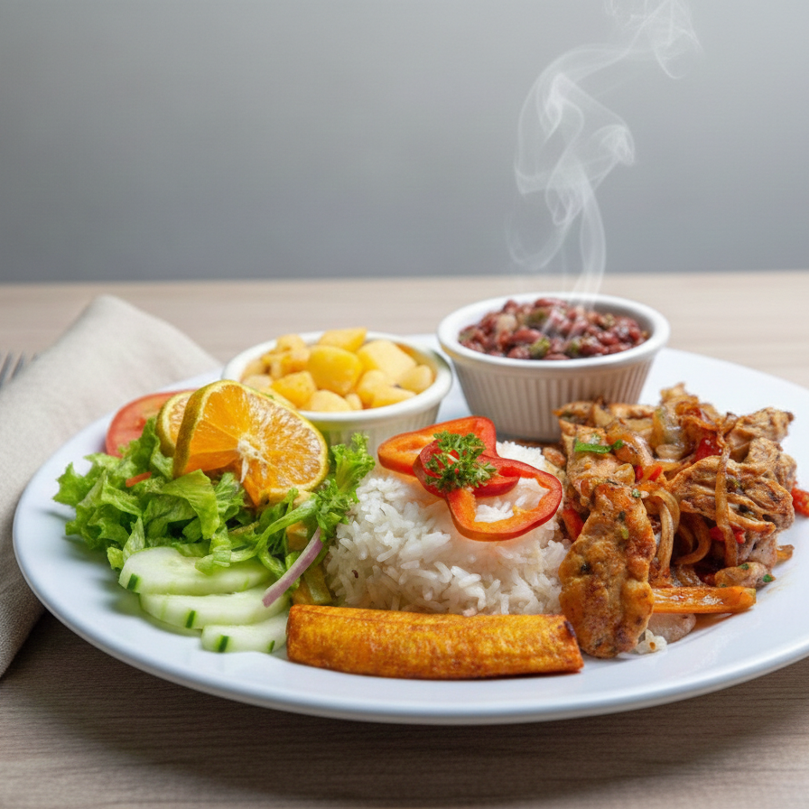 Arroz, frijoles, platano maduro, ensalada y proteina a escoger (no lleva picadillo).