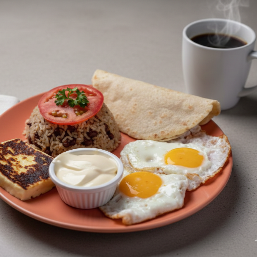 Gallo pinto, huevo, natilla, tortilla palmeada, maduro, proteína a elegir.