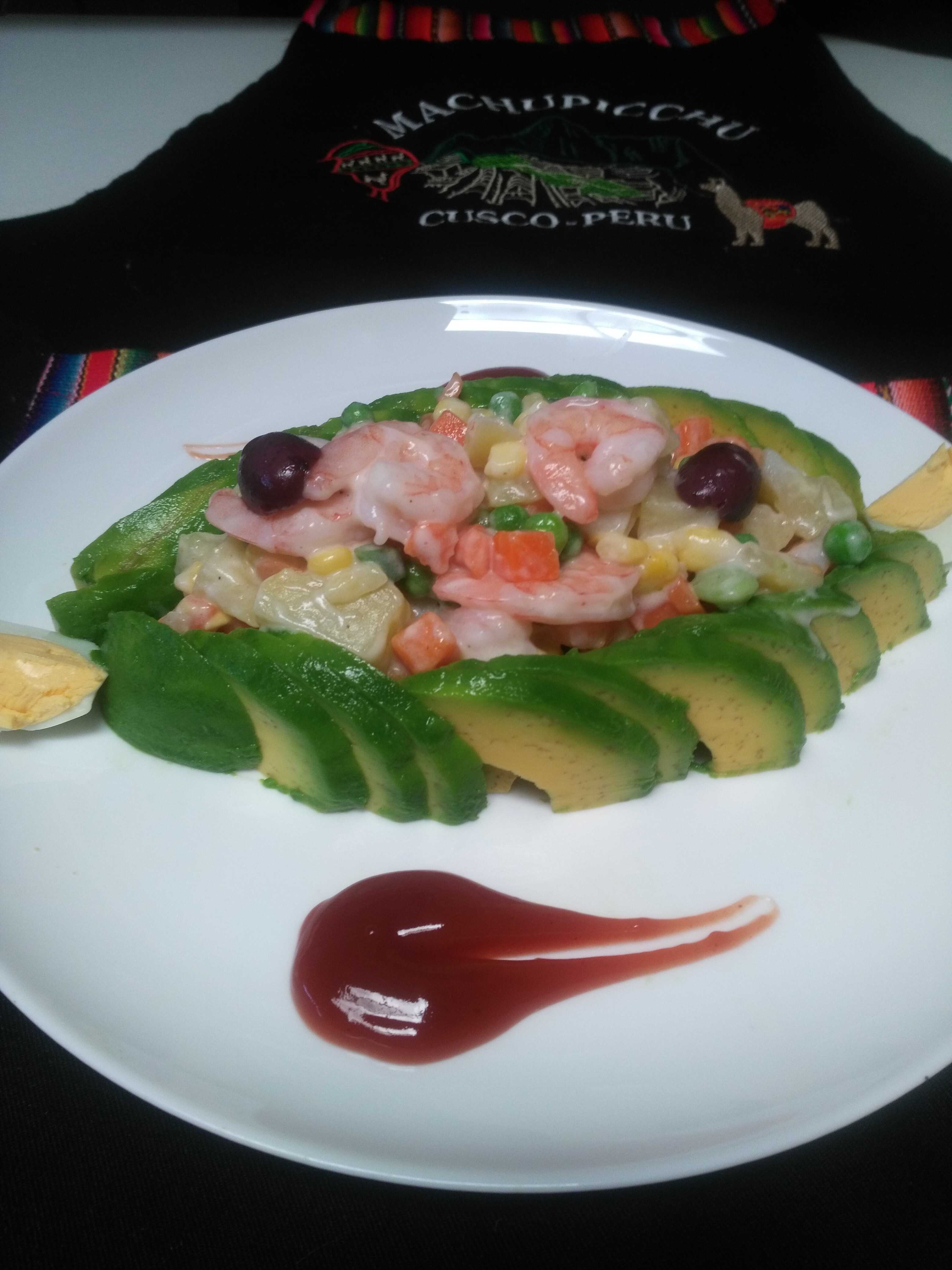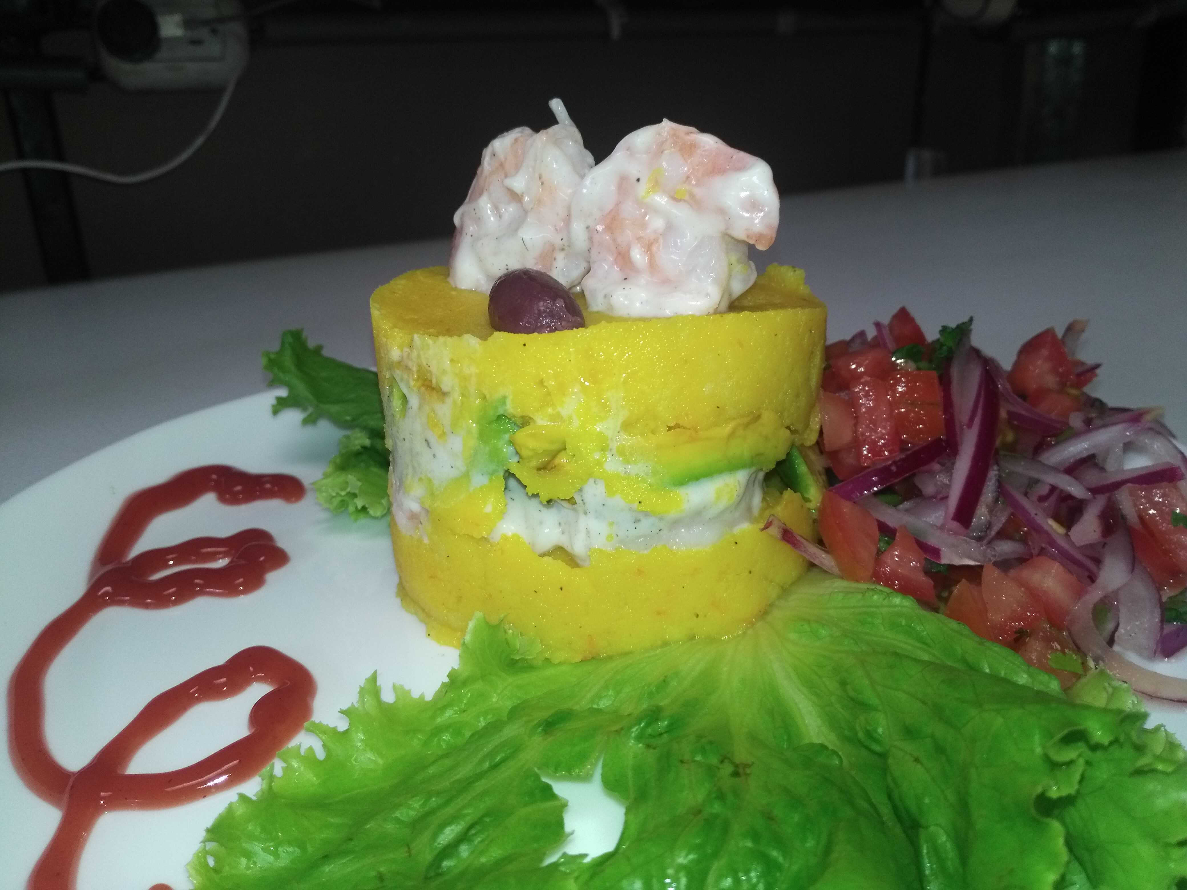 Pastel de papa frío, relleno de camarón, mayonesa y aguacate palta.