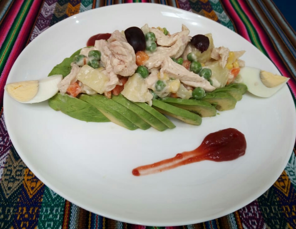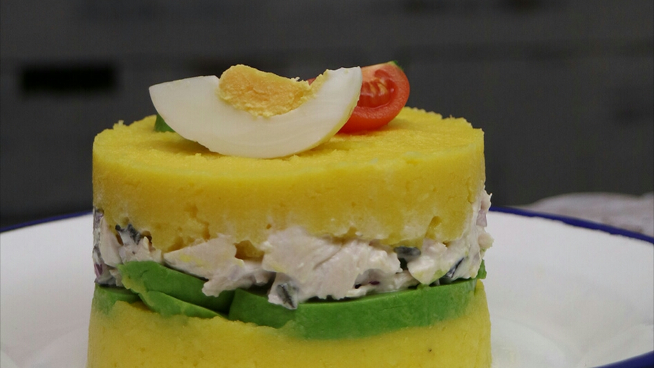 Pastel de papa frío, relleno de pollo, mayonesa y aguacate (palta).
