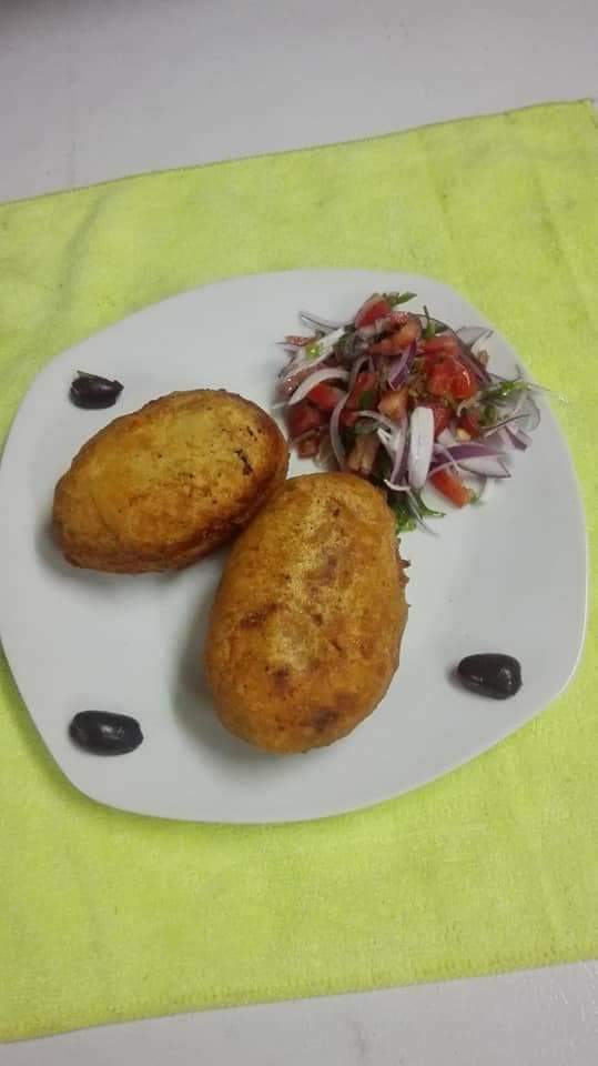 Rellena con carne de lomo y huevo, con ensalada criolla.
