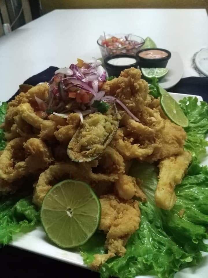 Variedad de mariscos empanizados, tamaño grande para 2 personas, acompañados con ensalada y cebolla morada.