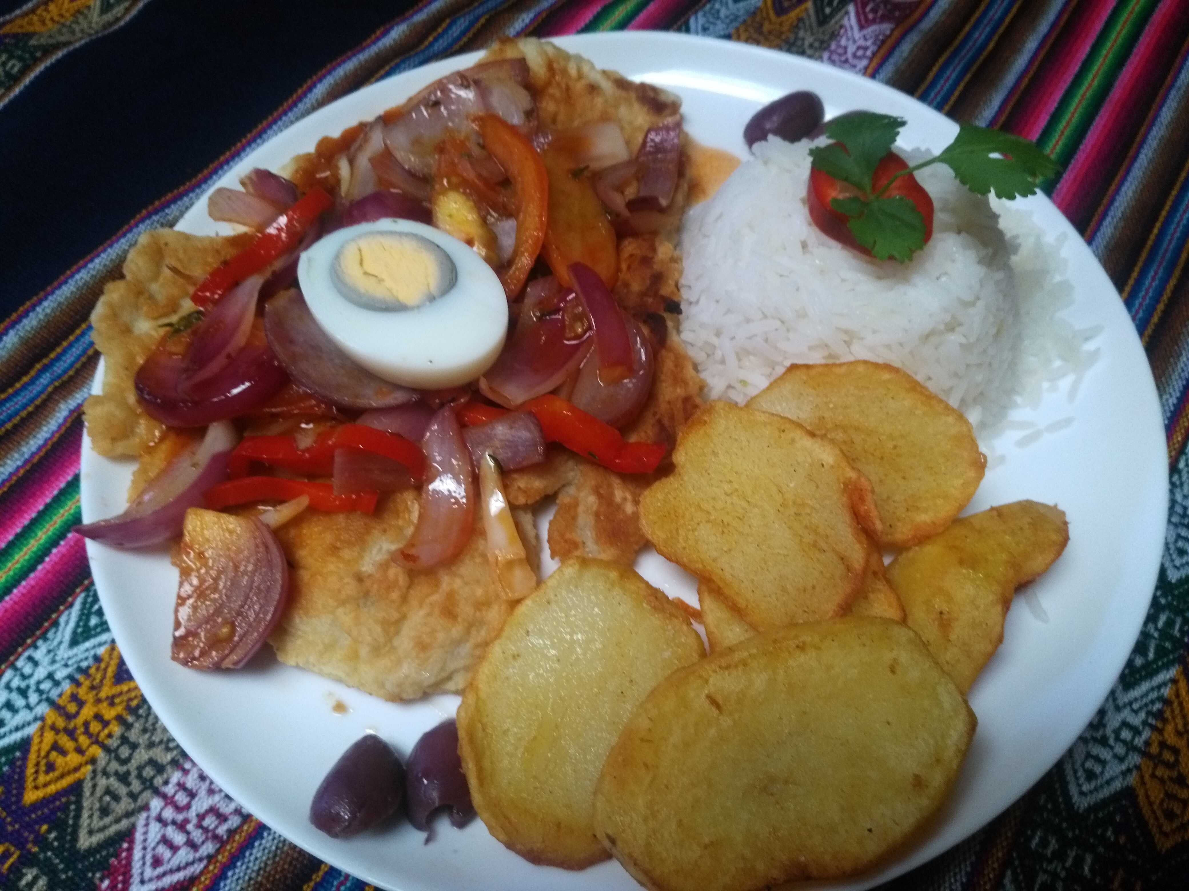 Filete de corvina cubierto de cebolla con salsa de ajo, aji panka y tomate con un toque de vino blanco.